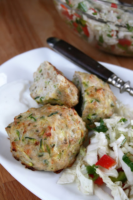 Od tygodnia staramy się jeść lekko, pilnując jednocześnie by nasze posiłki były zbilansowane. Jednak przyznam,że już zatęskniłam za pysznym, pachnącym kotlecikiem, najlepiej prosto z patelni, z ziemniaczkami... Dzisiejszy obiad będzie kompromisem - są kotlety, tyle że pieczone, i z lekkostrawnego mięsa indyczego. Połowę ich zawartości stanowią warzywa, a do nich, zamiast ziemniaków, podam surówkę oraz sos czosnkowy przygotowany na bazie naturalnego jogurtu.
