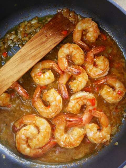 Mam dziś dla Was pomysł na lekki, pyszny posiłek - wspaniałe krewetki w dość pikantnym sosie z chili, octem balsamicznym i miodem. Zjedliśmy je na obiad z ogromną przyjemnością, były rewelacyjne. Użyłam produktu mrożonego,