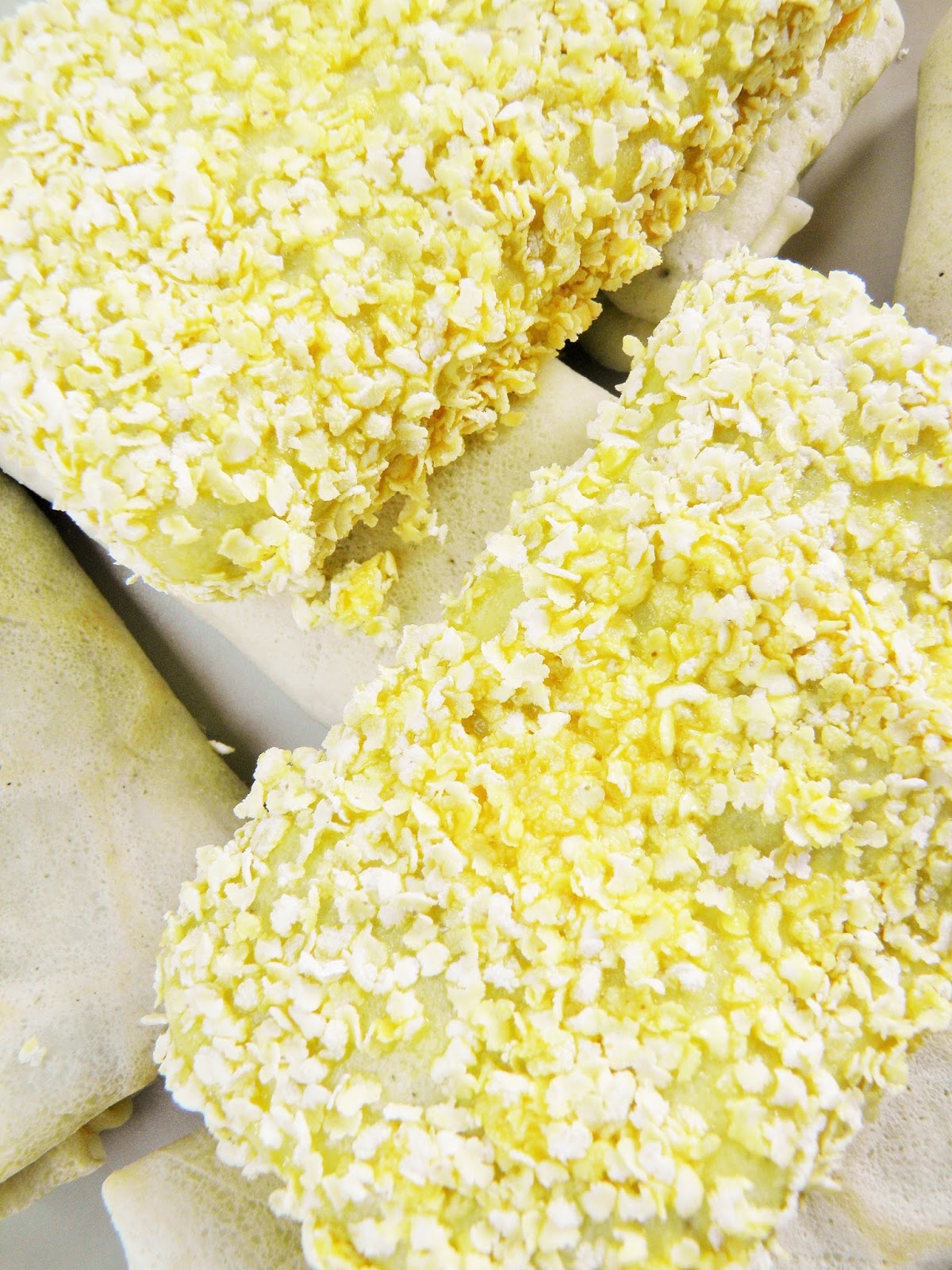Na usmażone naleśniki nakładam po porcji soczewicy, rozprowadzam masę po całej powierzchni, po czym zwijam krokiety. Panieruję je w roztrzepanym jajku i w płatkach jaglanych/bułce tartej. Smażę na średnim ogniu na rumiano z każdej strony.