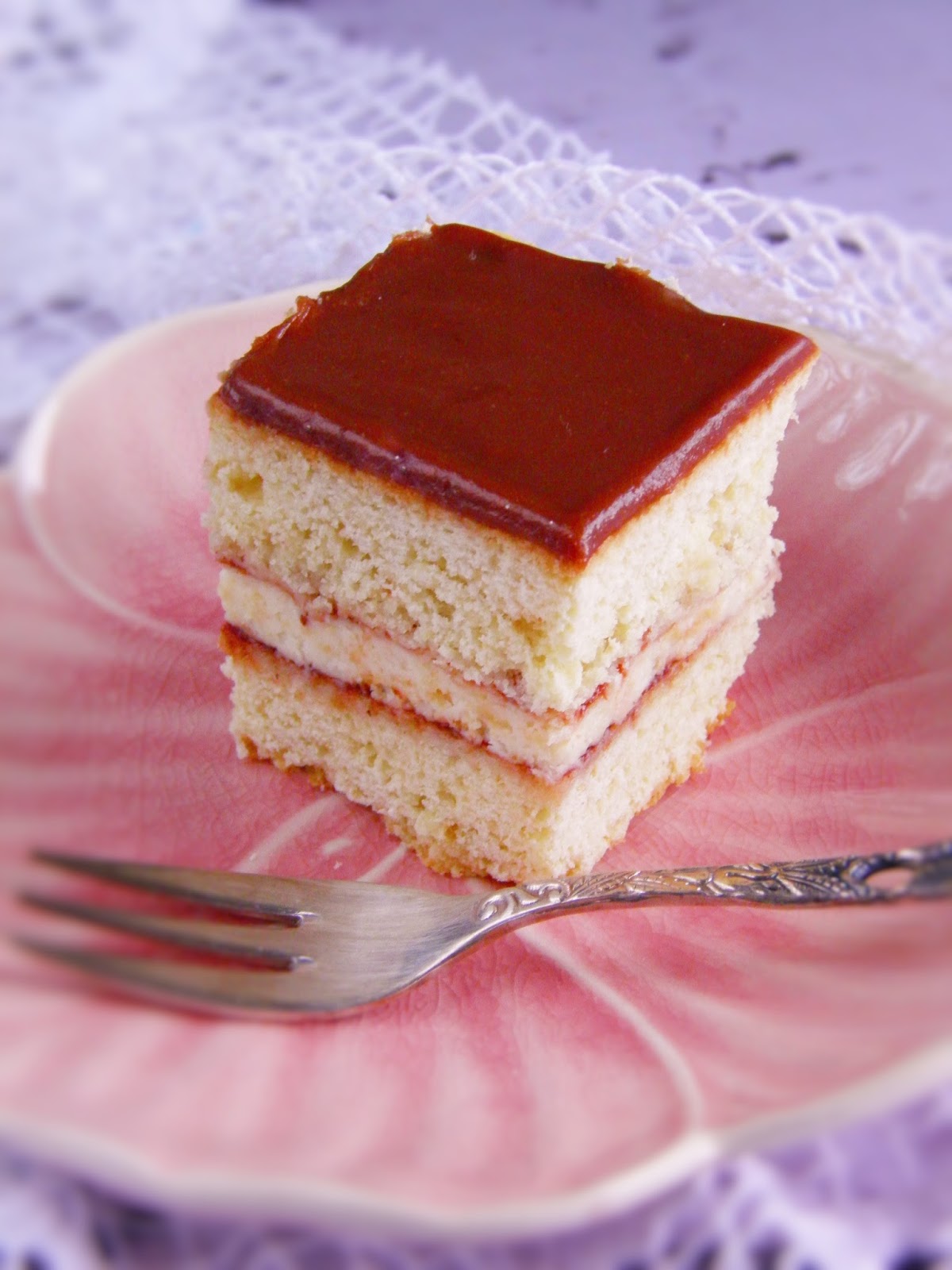 Wymyśliłam sobie takie ciacho: pyszne kruche blaty przełożone kremem, z polewą o smaku truskawek, i dżemem truskawkowym w środku. Jestem pewna, że Wam posmakuje!