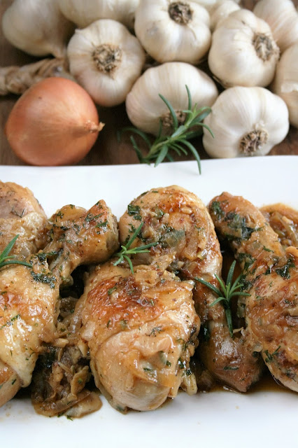 W sumie to lubię dusić kurczaka na patelni, bo tak naprawdę to niewymagający, a smaczny obiad. Mięso jest mięciutkie, a sos pachnący i delikatny w smaku (niech Was nie przeraża ilość użytego czosnku i cebuli- w czasie duszenia tracą swoją ostrość). Wszystko świetnie smakuje z ziemniakami, albo z ryżem.