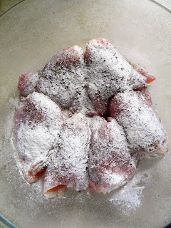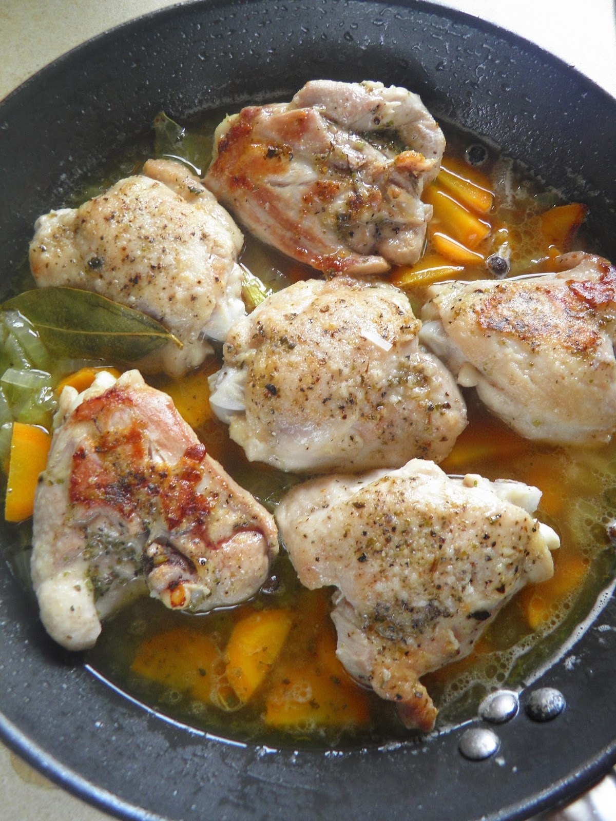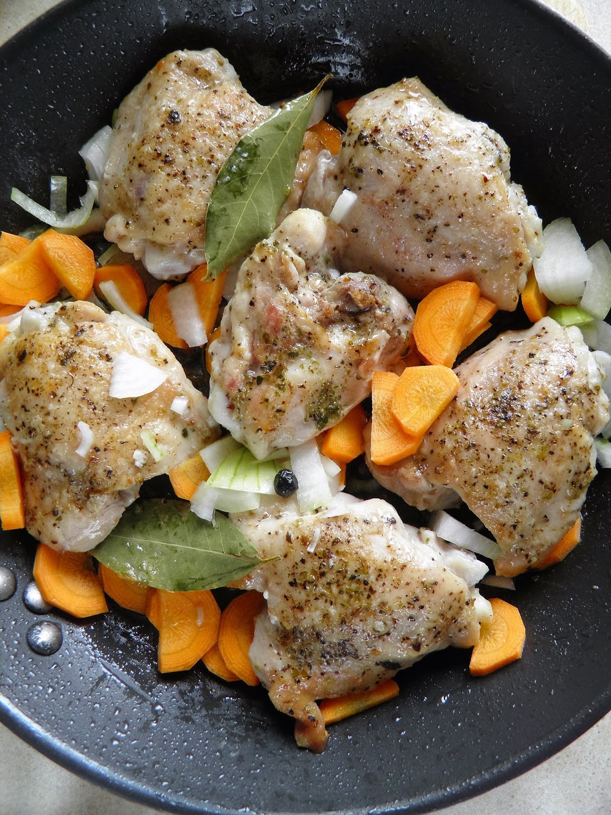 Z kawałków mięsa usuwam skórę, oprószam je solą, pieprzem, majerankiem i mąką. Rozgrzewam olej na patelni, układam mięso i pod przykryciem obsmażam je z obu stron na delikatny rumiany kolor. Następnie na patelnię dokładam liście laurowe, ziele angielskie, pokrojoną w kostkę cebulę i marchewkę (pokrojoną w półplasterki). Znów przykrywam patelnię i na małym ogniu smażę wszystko ok. 10 minut, uważając żeby się nic nie przypaliło. Następnie dolewam wodę, dodaję posiekany czosnek i pokruszony lubczyk, doprawiam wszystko wstępnie do smaku. Duszę pod przykryciem, na małym ogniu, do miękkości mięsa.