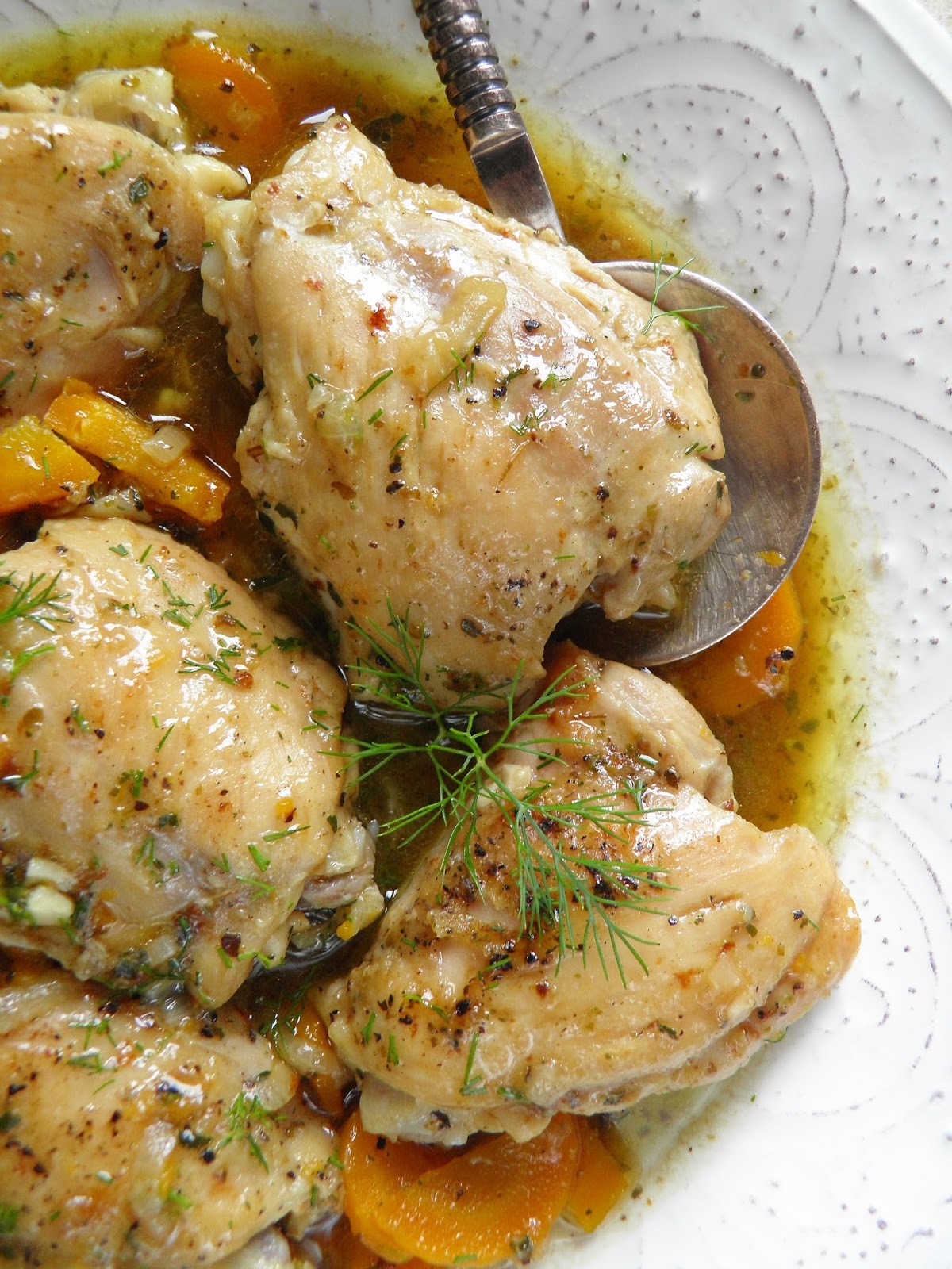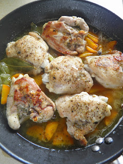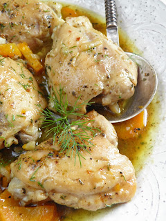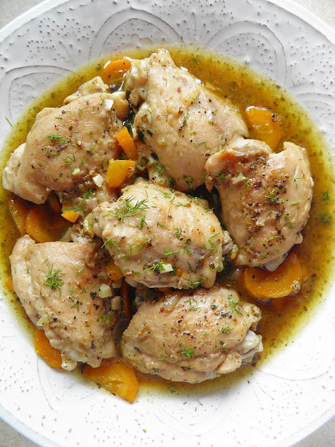 Kurczaka zrobiłam dziś gulaszowym sposobem - czyli lekko podsmażone mięso dusiłam do miękkości w sosie z cebulą, marchewką i ziołami. Wszystko na jednej patelni, bez zbędnego brudzenia innych naczyń.