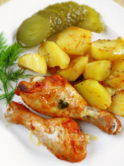 Kurczaka myję i osuszam, a następnie nacieram mieszanką soli, papryki i czosnku granulowanego. Przekładam do miski, miskę przykrywam i odstawiam na kilka godzin w chłodne miejsce. Ziemniaki obieram, myję i kroję na duże kawałki. Na dno naczynia, w którym wszystko będzie się piekło wlewam olej, układam ziemniaki, oprószam je solą i pieprzem, posypuję ziołami. Układam kawałki kurczaka, naczynie przykrywam folią aluminiową i wstawiam do piekarnika nagrzanego do 190 stopni C. na ok. godzinę. Po tym czasie sprawdzam, czy ziemniaki są miękkie, jeśli tak to zdejmuję folię i piekę wszystko do zrumienienia mięsa.