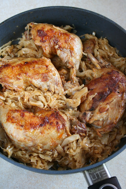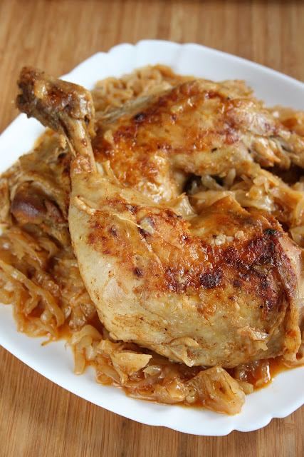 Miałam już kilka dni temu pokazać ten obiad, ale nie miałam czasu i dlatego ląduje na blogu dopiero dziś. Ostatnio dwukrotnie, w krótkim okresie, robiłam te gołąbki . Jak to po gołąbkach, przynajmniej u mnie, została kapusta. Taka piękna kapusta - szkoda wyrzucać :) Na dodatek już podgotowana, czyli szybsza i łatwiejsza do przygotowania. Złożyło się też, że gotowałam na kurczaku tę zupę z kalafiorem i kaszą jaglaną. Ugotowały się w wywarze kurczęce udka, mięciusie, pyszne - a jako że zupa i tak już była sycąca i bogata, powstał z nich i z wymienionej wcześniej kapusty całkiem oddzielny obiad. Oczywiście możecie po prostu podgotować troszkę kapustę i kurczaka specjalnie do tego dania.
