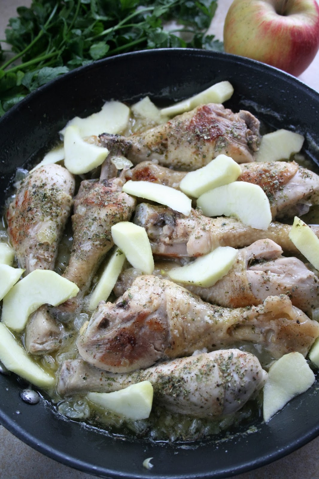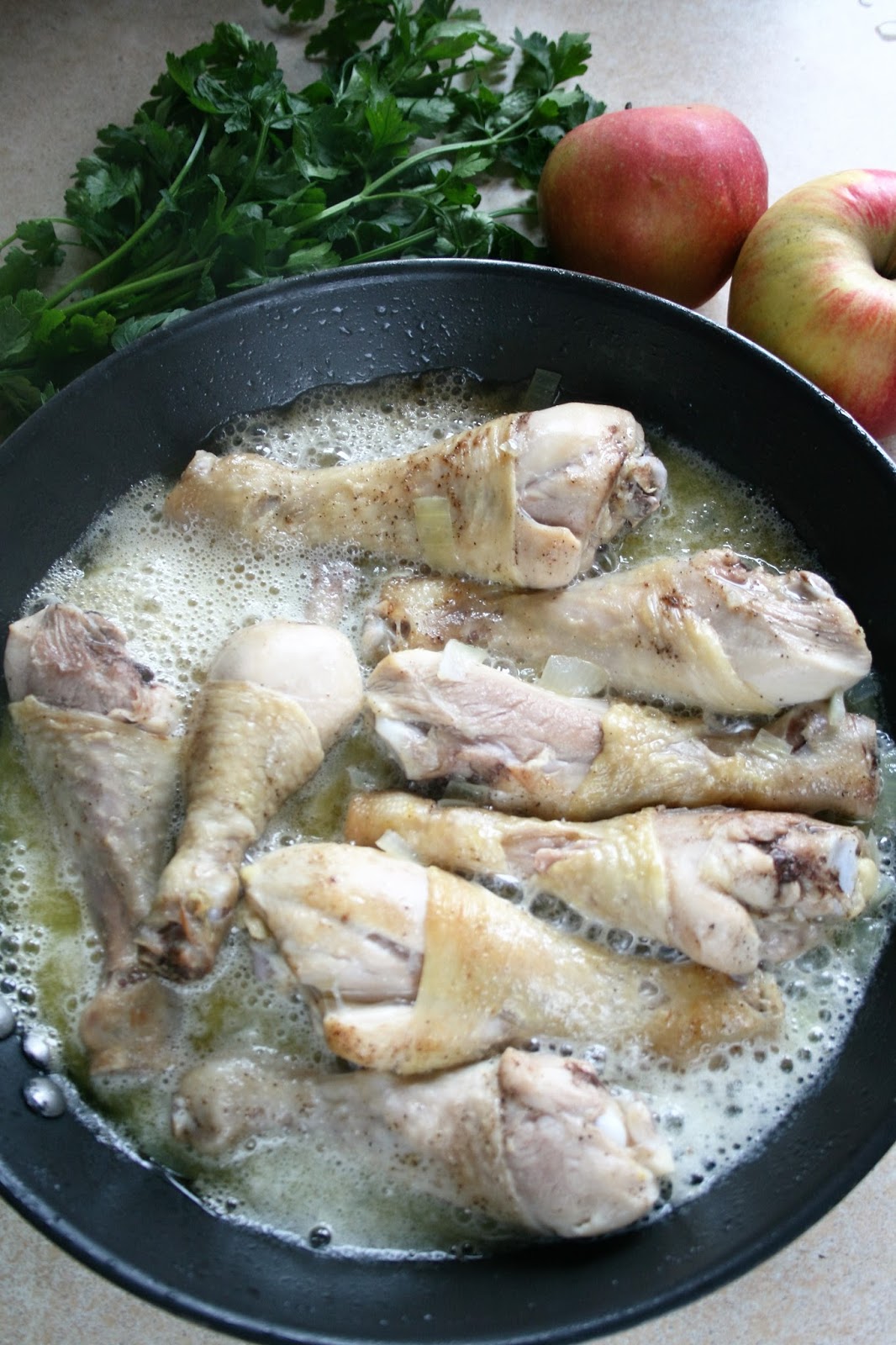 Składniki:8-10 pałek z kurczaka1 cebula2 ząbki czosnku0,5 szklanki cydru3 łyżki oleju do smażenia1-2 łyżki śmietany 18%1 łyżeczka majeranku1 jabłko, niezbyt słodkiesól, pieprz do smakuposiekana natka pietruszki Przygotowanie:Kurczaka oprószam solą i pieprzem, i podsmażam na lekko złoty kolor na oleju. Dodaję pokrojoną w kostkę cebule, przykrywam patelnię i na średnim ogniu podsmażam do jej zeszklenia. Dodaję majeranek, dolewam cydr i na małym ogniu duszę wszystko do miękkości mięsa. Dodaję pokrojone w kawałki (obrane) jabłko, przeciśnięty przez praskę czosnek, doprawiam sos solą i pieprzem. Na koniec posypuję posiekaną natką pietruszki.