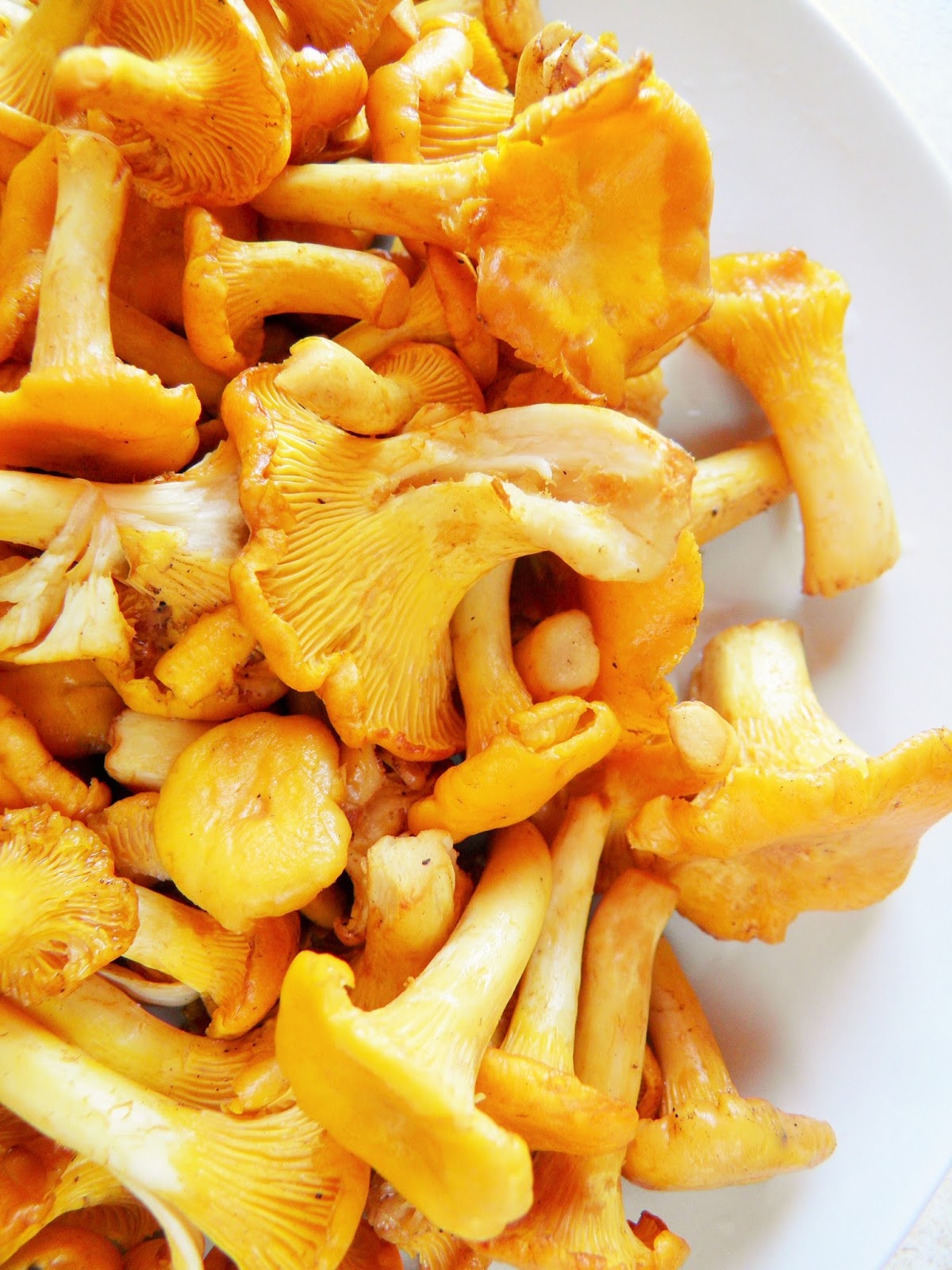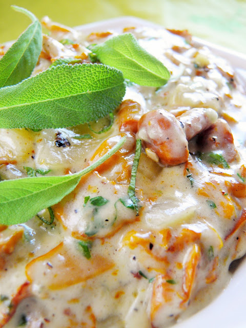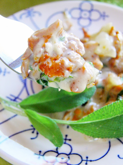 Już się cieszę na nadchodzący czas grzybów. W tym roku znalazłam na razie jednego zajączka, i to zupełnie przypadkiem, bo na skraju lasu, na zupełnie niegrzybowym spacerze. Dzisiejsze kurki kupiłam trochę dlatego, żeby przypomnieć sobie jak smakują, i zrobiłam je tak jak najbardziej lubię - ze śmietanką i cebulką. Tylko szałwia jest nowością, przyjemnym dodatkiem który nadał potrawce lekkiej słodyczy.
