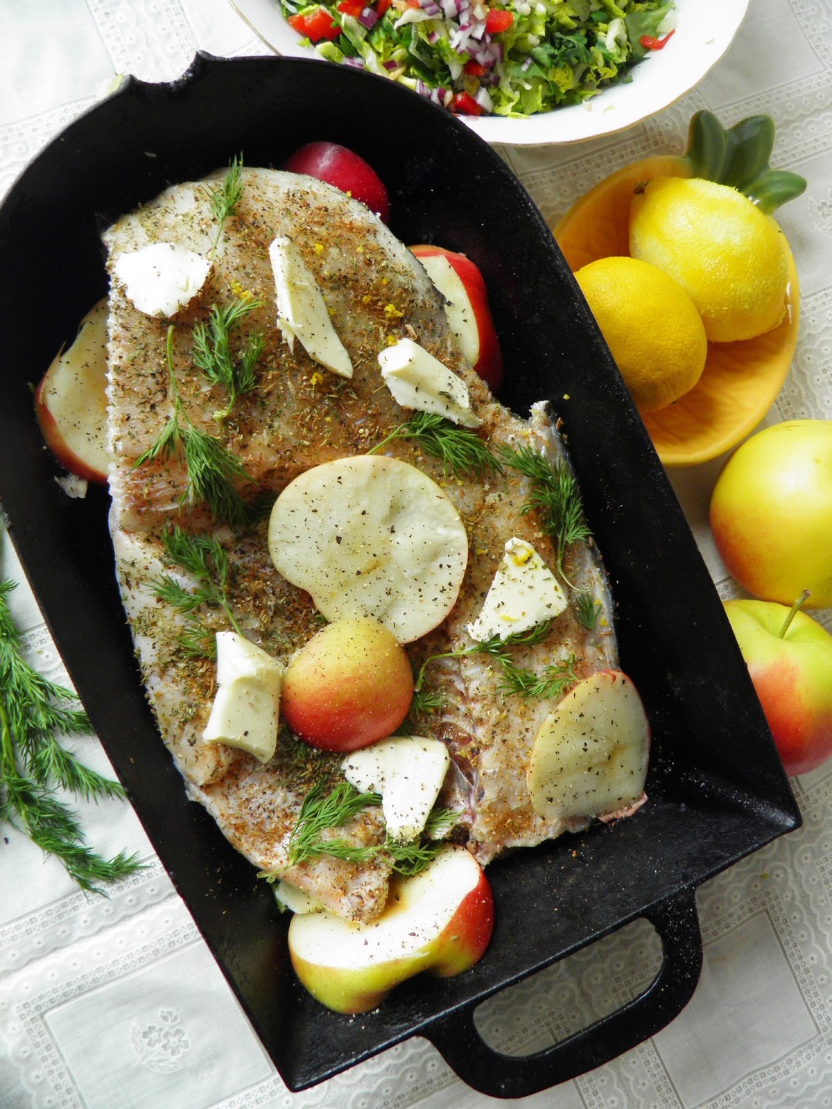 Rybę myję i dokładnie suszę, po czym nacieram mieszanką przypraw. Na dno naczynia do pieczenia wlewam olej i wkładam połowę masła, układam rybę, a dookoła pokrojone w grube plastry jabłko. Wszystko oprószam skórką z cytryny i układam dodatkowo gałązki świeżego kopru. Umyte i obrane marchewki kroję wzdłuż w cieniutkie plastry (obieraczką do warzyw), układam dodatkowo na rybie. Wszystko oprószam pieprzem, układam pozostałe masło. Przykrywam folią aluminiową. Naczynie wstawiam do piekarnika nagrzanego do 180 stopni C. i piekę 30 minut pod folią, po czym zdejmuję folię i piekę jeszcze 25-30 minut.