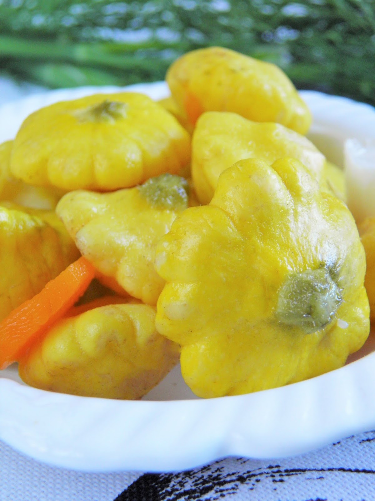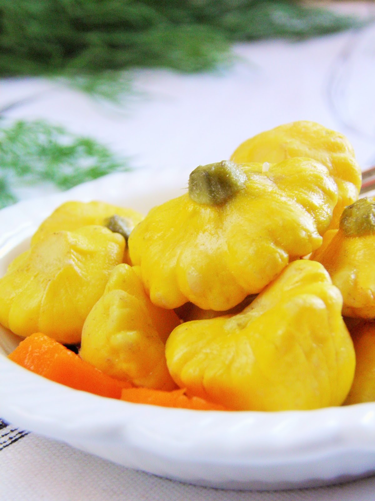 Marynowane patisony mogą być dodatkiem do sałatek, czy kanapek. Mogą również same w sobie stanowić ciekawą przekąskę. Do marynaty używamy młode, niewielkie patisony o średnicy kilku centymetrów. Składniki:- młode patisony.Zalewa: - 1,5 l wody,- 1,5 szk...