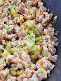 Miksuję składniki ciasta i odstawiam je na 10 minut, po czym smażę naleśniki (moje smażyłam na małej patelni). Na 2 łyżkach oleju podsmażam posiekaną drobno cebulę , po czym dodaję mięso, lekko wszystko solę i smażę, rozdrabniając, aż zniknie różowy kolor surowego mięsa. Przekładam zawartość patelni do miski, a na niej rozgrzewam masło i dodaję posiekanego pora. Lekko go solę i oprószam pierzem i duszę pod pokrywką do zeszklenia. Do podduszonego pora dodaję z powrotem mięso i przeciśnięty przez praskę czosnek, smażę chwilę razem, po czym dolewam przecier, doprawiam do smaku solą i pieprzem.