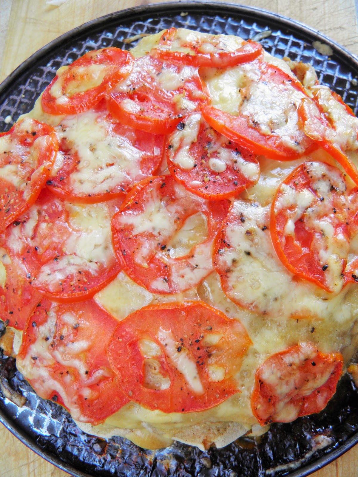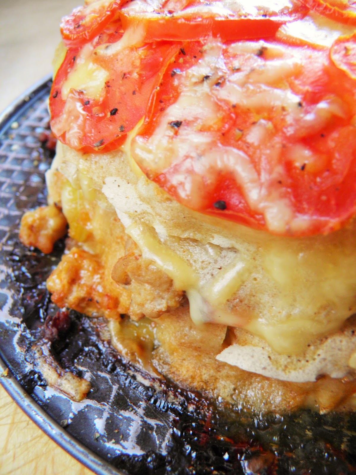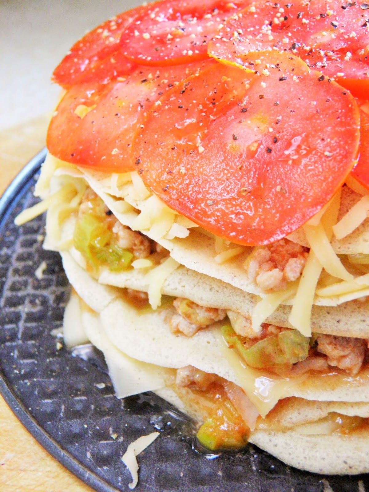 Układam tort na dnie natłuszczonej formy (wykorzystałam tortownicę): na każdy naleśnik sypię odrobinę sera, na niego warstwę mięsa, znów odrobinę sera i kolejny naleśnik. Wykorzystałam 8 naleśników. Ostatni obficie posypuję serem, na nim układam plastry pomidora oprószone pieprzem i jeszcze raz posypuję serem. formę przykrywam i wstawiam do piekarnika nagrzanego do 200 stopni C. na 35 minut, po czym odkrywam ją i pozwalam, by powierzchnia się lekko zarumieniła. Podaję na gorąco, z porcją pyszności od