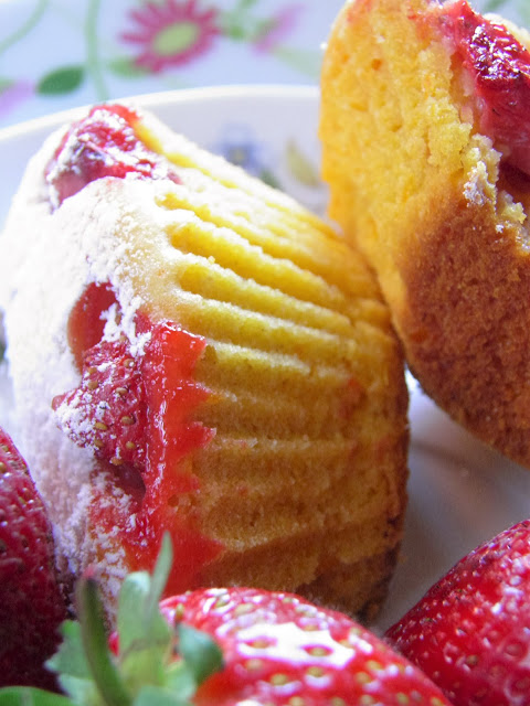 Piekłam dziś warzywa do sałatki, były wśród nich słodkie bataty. Bardzo lubię je takie gorące, prosto z piekarnika, jeść z solą i masłem - próbowaliście? Ale nie o tym chcę mówić - postanowiłam spróbować wykorzystać jednego batata jako składnik ciasta i upiekłam muffiny z truskawkami. Batat dodał im ślicznego, głębokiego koloru, a w smaku jest niewyczuwalny.