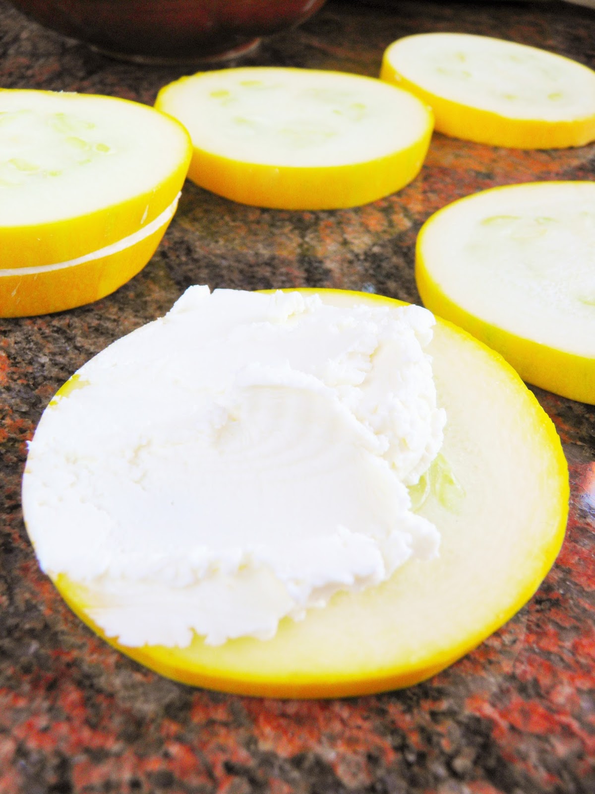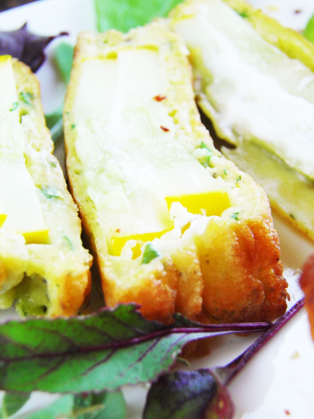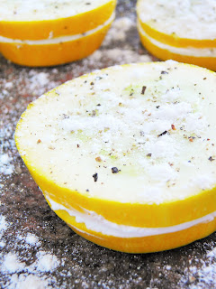 Składniki:1 średniej wielkości żółta cukiniaok. 100 g. śmietankowego serka kanapkowegoCiasto:2 jajka4 pełne łyżki mąki + trochę do panierowaniapół małej cebulisporo posiekanej natki pietruszki1-2 łyżki lekko gazowanej wody mineralnejsól, pieprz do smakuDodatkowo:olej do smażeniaPrzygotowanie: Mieszam jajka z mąką, wodą, posiekaną pietruszką i bardzo drobno pokrojoną cebulą, doprawiam ciasto solą i pieprzem do smaku. Umytą cukinię kroję w plasterki ok. 3 mm. Smaruję jeden plaster cienką warstwą serka i łączę z drugim- ważne by były w kolejności krojenia. Tak połączone plastry oprószam pieprzem i lekko posypuję mąką. Panieruję je w cieście i przekładam na patelnię ze średnio rozgrzanym olejem. Smażę na złoto z każdej strony. Plastry powinny się smażyć po ok. 3 minuty a każdej strony, by nie były surowe. Podaję na gorąco.Przepis autorski.