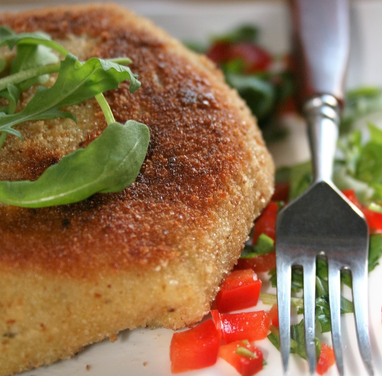 Okrągłe krokiety z boczkiem, jabłkiem, rukolą i mozzarellą