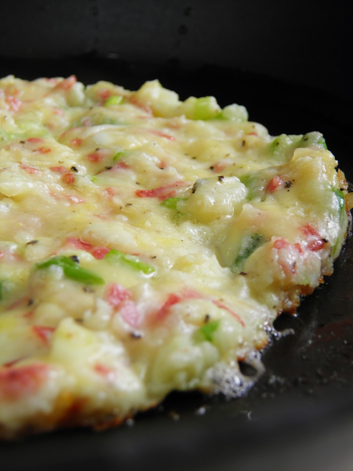 Wykombinowałam sobie z tymi ziemniakami przepyszne śniadanie, i będę od czasu do czasu ten pomysł powtarzać, bo rzecz wyszła genialna. Dodałam jajko, trochę posiekanej salami, tarty ser i szczypiorek. Usmażyłam cienki placek, zwinęłam go w rulonik, dzięki czemu apetycznie rumiana skórka była nie tylko na zewnątrz, ale i w środku. Zjadłam wszystko z wielką przyjemnością!