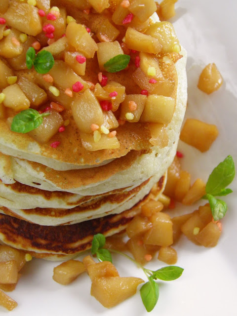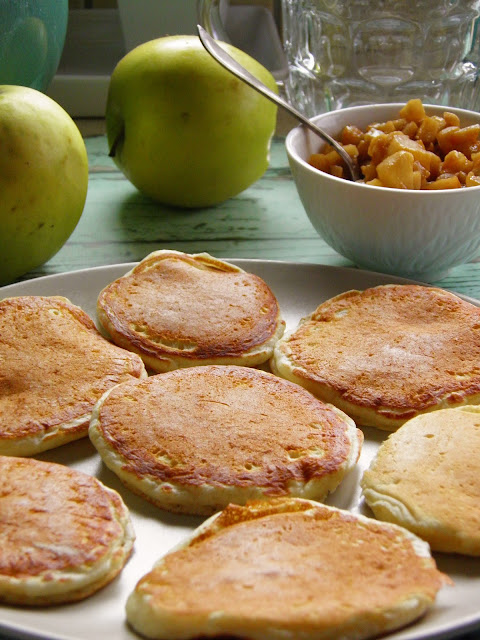 Zapas jabłek składnia mnie ostatnio do wymyślania, jak je wykorzystać. Lubimy wszystkie placki, racuchy itd, więc dziś obiad było słodki i deserowy - bardzo delikatne placki po amerykańsku, czyli pancakes, podane z prażonymi jabłkami o smaku toffi. Polecam nie tylko dzieciom, które na pewno taki obiad pokochają :)