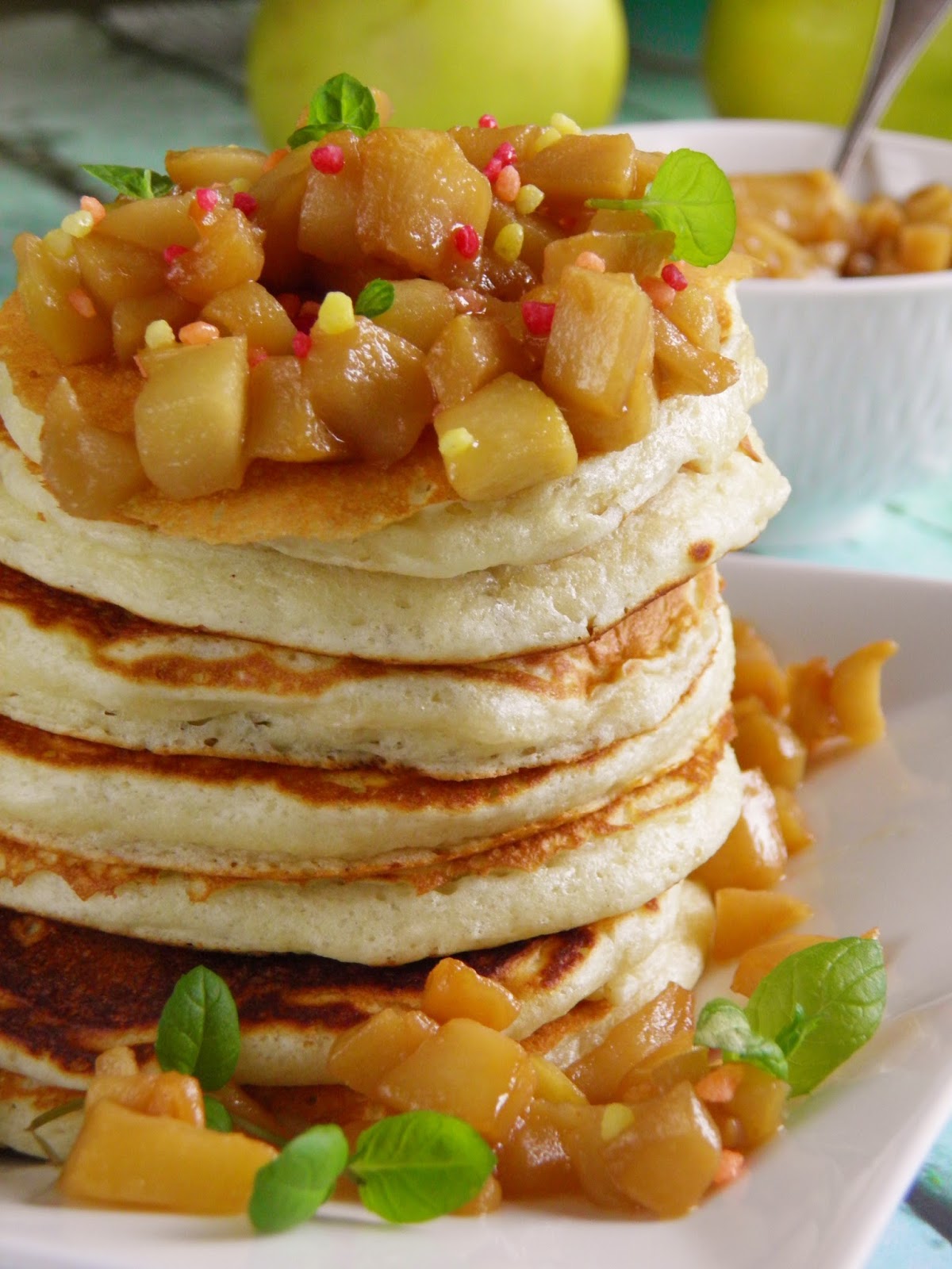 Składniki na ok. 20 sztuk:1 szklanka mąki pszennej1, 5 pełnej łyżeczki proszku do pieczenia1,5 łyżki cukru pudru2 łyżki domowego cukru waniliowegoszczypta soli1 szklanka mleka1 jajko30 g. masła, rozpuszczonegoJabłka toffi:3 dużej jabłka1 łyżka masła1 łyżeczka soku z cytryny1 pełna łyżka ciemnego cukru (może też być jasny)kilka łyżek słodkiej śmietankiPrzygotowanie:Jabłka toffi: obrane jabłka kroję w małą kostkę. Rozgrzewam masło na patelni, wrzucam jabłka, mieszając smażę na średnim ogniu ok. 5 minut. Następnie dodaję cukier i sok z cytryny, mieszam aż do rozpuszczenia cukru. Zwiększam ogień i smażę jabłka kolejne 5 minut, a na koniec wlewam śmietankę i mieszając duszę kolejne 5 minut.Pancakes: łączę w jednej misce suche składniki (przesiewam przez sito), a drugiej trzepaczkę ubijam chwilę mleko z jajkiem i płynnym masłem. Zawartość obu misek łączę i mieszam trzepaczką do połączenia się.Rozgrzewam patelnię z nieprzywierającą powłoką i łyżką wlewam po porcji ciasta (moja rada: maksymalnie 3 placki na patelni, bo rosną i rozlewając się w trakcie smażenia). Smażę krótko z obu stron, pomagając sobie drewnianą łopatką przy przewracaniu. Podaję na gorąco z ciepłymi jabłkami.