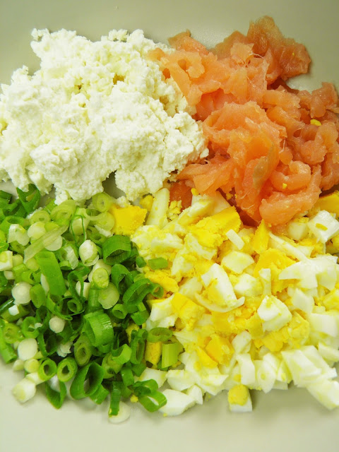 Jajka gotuję na twardo, siekam drobno. Twaróg rozdrabniam widelcem, łososia kroję cieniutko. Wszystkie składniki przekładam do miski i dokładnie ucieram, by się połączyły, doprawiam do smaku solą i pieprzem.Przepis autorski.