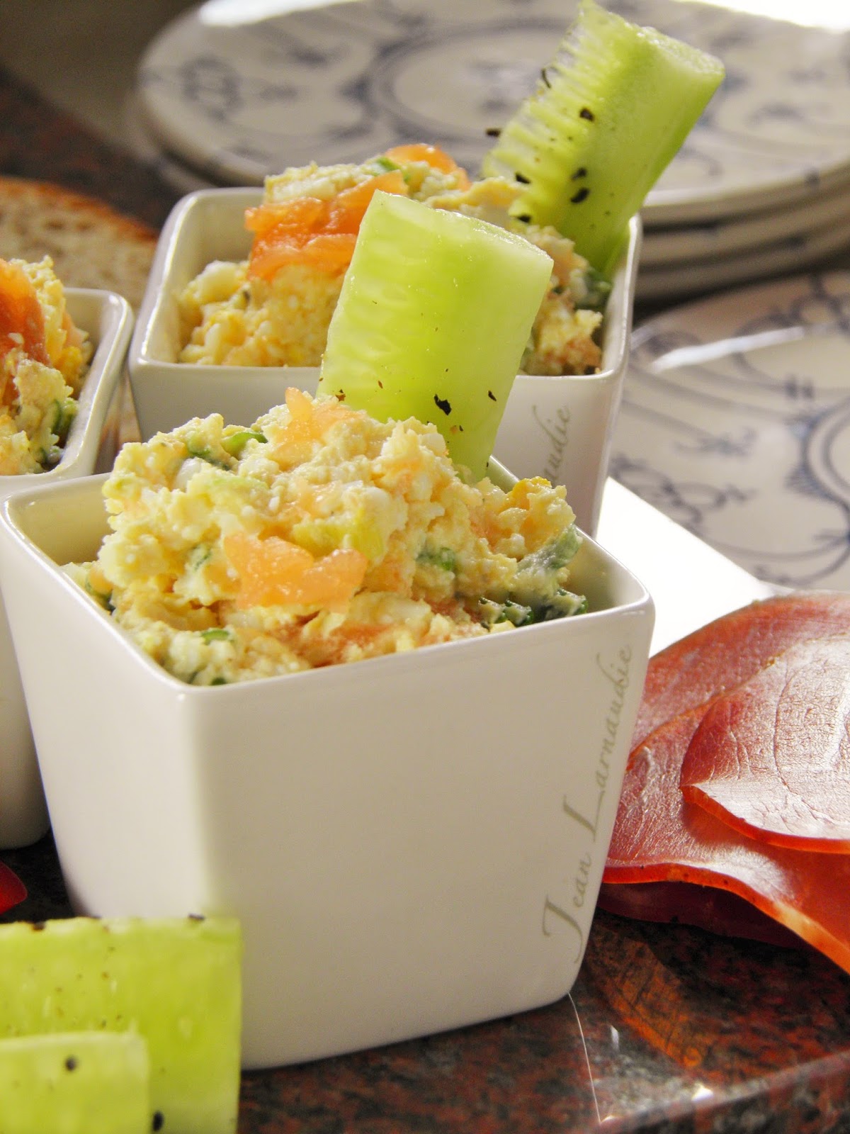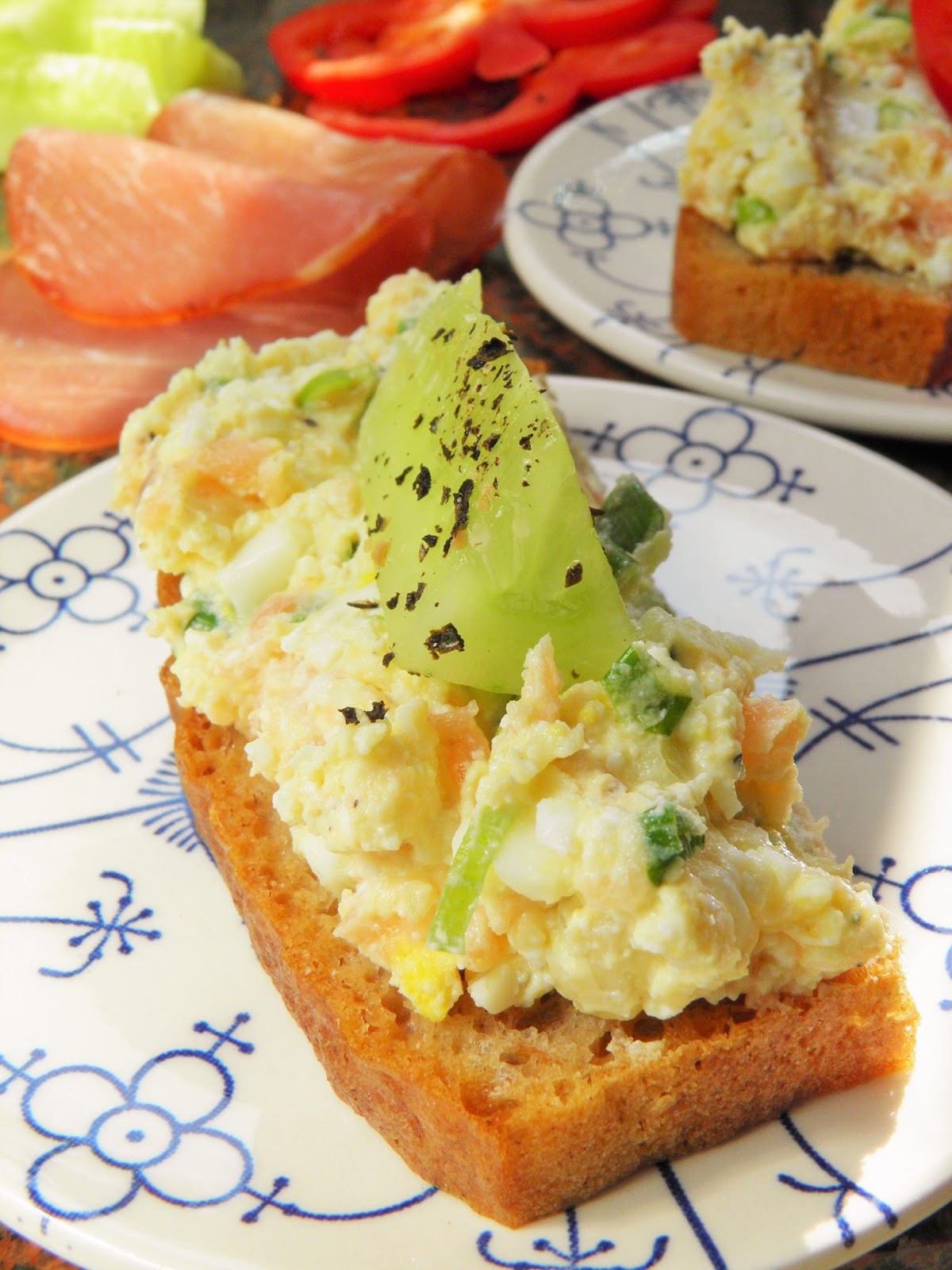 Składniki:50 g. twarogu półtłustego2 jajkaok. 100 g. wędzonego łososia1 łyżeczka jogurtu naturalnegoposiekany szczypioreksól, pieprz do smakuPrzygotowanie:
