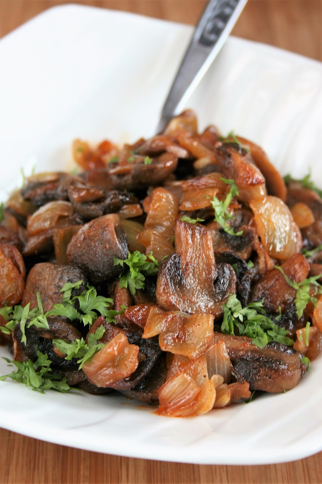 Bardzo lubię pieczarki, odkąd dawno dawno temu zajadałam się bułką z farszem pieczarkowym na dworcu w Bielsko-Białej. Podduszone na patelni są świetnym dodatkiem do obiadu. Bardzo smakują mi w dzisiejszej wersji - ze sporą ilością czosnku i słodką czerwoną papryką.