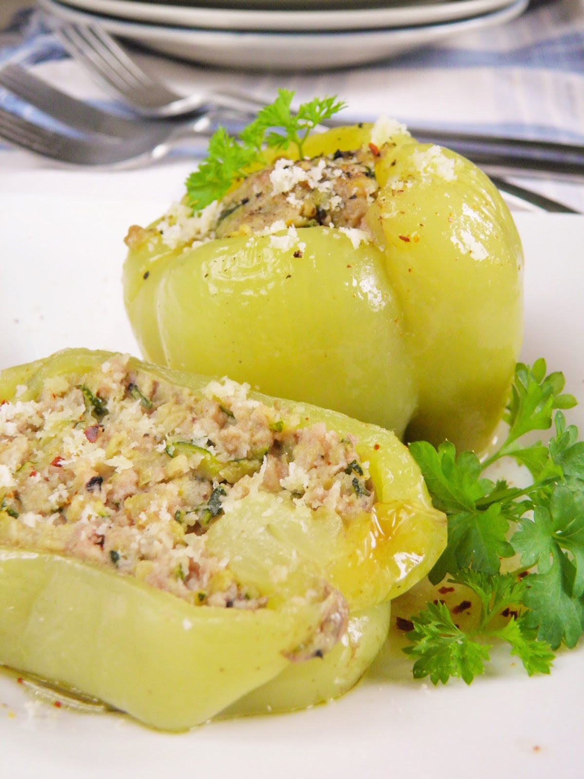 Z papryk ścinam czapki (od ogonków), wydrążam gniazda nasienne i faszeruję je masą z mięsa i cukinii. Tak przygotowane układam w naczyniu do pieczenia, na dno którego wcześniej wlewam olej. Przykrywam szczelnie naczynie i wstawiam do piekarnika nagrzanego do 200 stopni C. na godzinę, po czym odkrywam je i piekę jeszcze 10 minut, by papryki się lekko zarumieniły.Przed podaniem oprószam startym parmezanem.