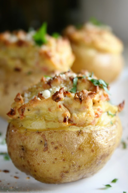 Młode ziemniaki nadziewane porem i szynką