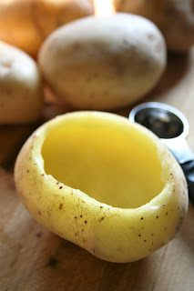 Ziemniaki dokładnie myję szczoteczką. Ostrym nożykiem zaznaczam na górze płasko ułożonego na desce ziemniaka (tak, by stabilnie leżał) okrąg - z niego obieram łupinkę. Następnie łyżeczką do melona wydrążam środek każdego ziemniaka, jak na zdjęciu, uważając by pozostawić miąższ przy ściankach. Tak przygotowane ziemniaki przekładam do dużej miski i zalewam zimną wodą, by nie ściemniały. Wydrążony miąższ przekładam do rondelka i gotuję do miękkości razem z garścią łodyżek z natki pietruszki (można oczywiście ugotować ziemniaki bez nich). W międzyczasie obieram i bardzo drobno siekam cebulę, kroję też szynkę w bardzo drobną kostkę. Cebulę podsmażam do zeszklenia na niewielkiej ilości oleju. Ugotowane, gorące ziemniaki dokładnie duszę widelcem na puree, dodając masło - masa musi być bardzo gładka. Oczywiście wcześniej pozbywam się łodyżek pietruszki. Do ciepłej masy dodaję cebulę (staram się odsączyć ją z tłuszczu), pokrojoną szynkę, żółtko, przeciśnięty przez praskę czosnek i sól oraz pieprz do smaku. Białko ubijam na sztywną pianę i delikatnie łączę z masą ziemniaczaną. Wyjmuję z wody i dokładnie odsączam wcześniej wydrążone ziemniaki, każdy w środku lekko oprószam solą, pieprzem i majerankiem. Następnie każdy wypełniam przygotowaną masą - z czubkiem (trochę masy pewnie zostanie, na to też mam pomysł, ale o tym w oddzielnym poście). Tak przygotowane ziemniaki układam na blaszce lekko natłuszczonej olejem i wstawiam do piekarnika nagrzanego do 190 stopni C (góra-dól, bez termoobiegu) na ok. 60 minut. Na 10-15 minut przed końcem pieczenia każdy ziemniak oprószam startym parmezanem/żółtym serem. Gdy ten się zarumieni, podaję ziemniaki np. z sosem czosnkowym.