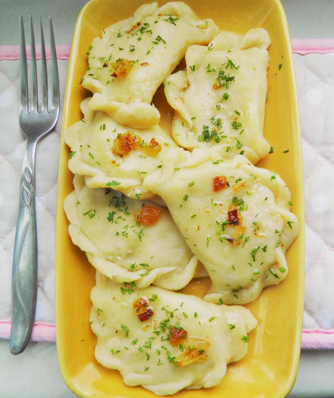 Te pierogi ogólnie rzecz biorąc są lekkie - z nadzieniem z czerwonej soczewicy doprawionej cebulką i czosnkiem, a samo ciasto jest przygotowane z dodatkiem masła, co sprawia że są miękkie i delikatne. Podałam je polane cebulką i posypane koperkiem, do tego tylko szklanka maślanki i pyszny, tani obiad gotowy :)