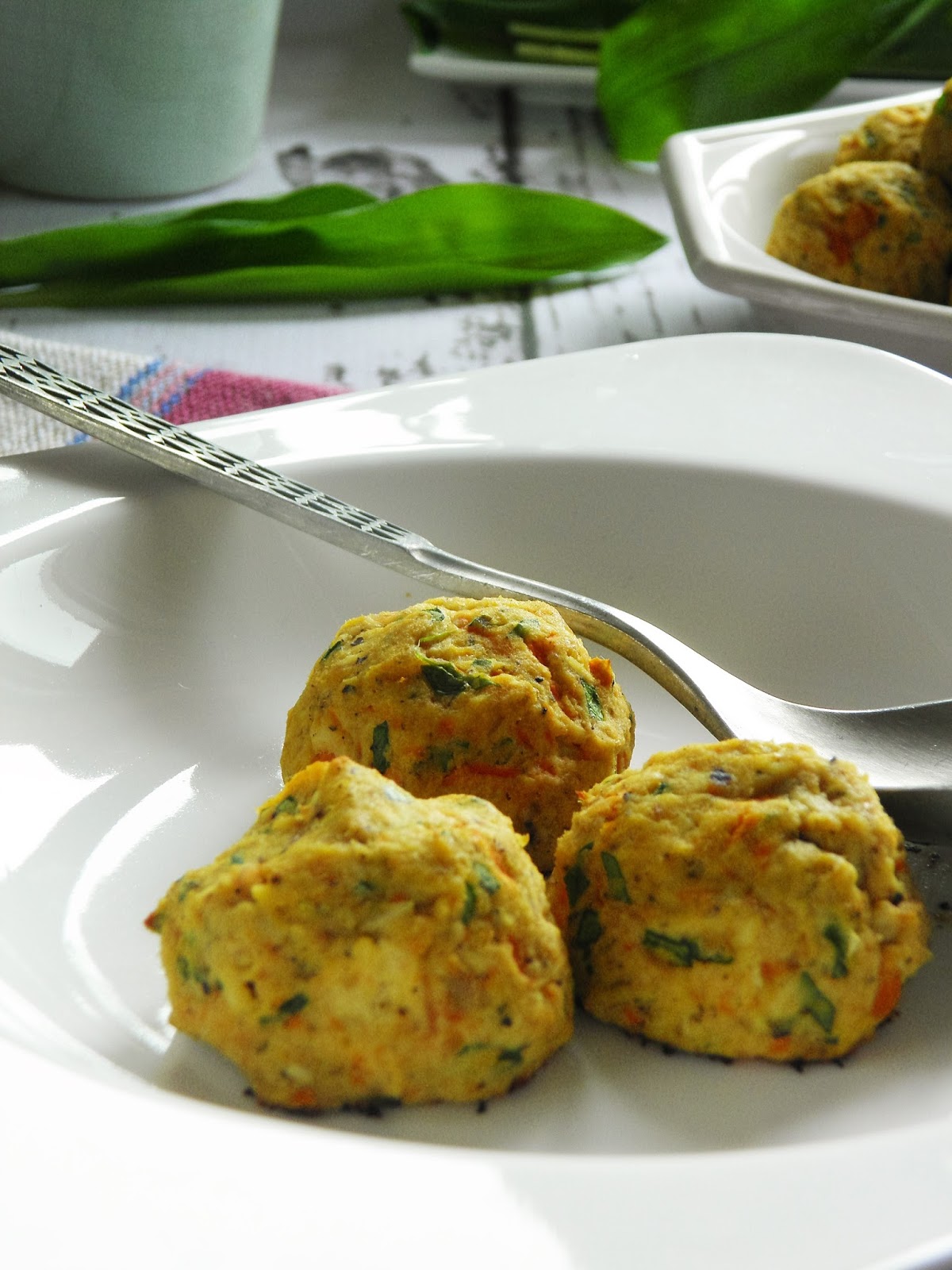 Składniki:1 litr wywaru mięsno-warzywnego (rosół)2 małe słoiczki koncentratu pomidorowego200 g. śmietankowego serka topionego1 łyżeczka musztardy2 ząbki czosnkuposiekane zioła: czosnek niedźwiedzi, tymianek, majeraneksól, pieprz do smakuKlopsiki:mięso z rosołu (obrane z kości) - u mnie filet w piersi kurczaka i pałki, łącznie ok. 400 g.warzywa z rosołu: ugotowane marchewki, pietruszka, seler, cebula1 łyżeczka musztardy2 łyżki posiekanego czosnku niedźwiedziegosól, pieprz do smakuolej do natłuszczenia blachyewentualnie 1 jajko i bułka tarta - jeśli ktoś woli twardsze pulpecikiPrzygotowanie:Klopsiki: mięso i warzywa przepuszczam przez maszynkę lub blenduję, do masy dodaję musztardę , posiekany czosnek niedźwiedzi i przyprawy do smaku. Ewentualnie można dodać jajko i bułkę tartą, ale klopsiki będą wtedy twardsze. Formuję kulki wielkości małej mandarynki i układam je na natłuszczonej olejem blasze, wstawiam ją do piekarnika nagrzanego do 190 stopni C. na 30 minut.Zupa: koncentrat pomidorowy mieszam w rosole, dodaję posiekane zioła, musztardę, przeciśnięty przez praskę czosnek i serki topione. Podgrzewam do rozpuszczenia serka, blenduję, doprawiam do smaku. Podaję z klopsikami i ziołami.
