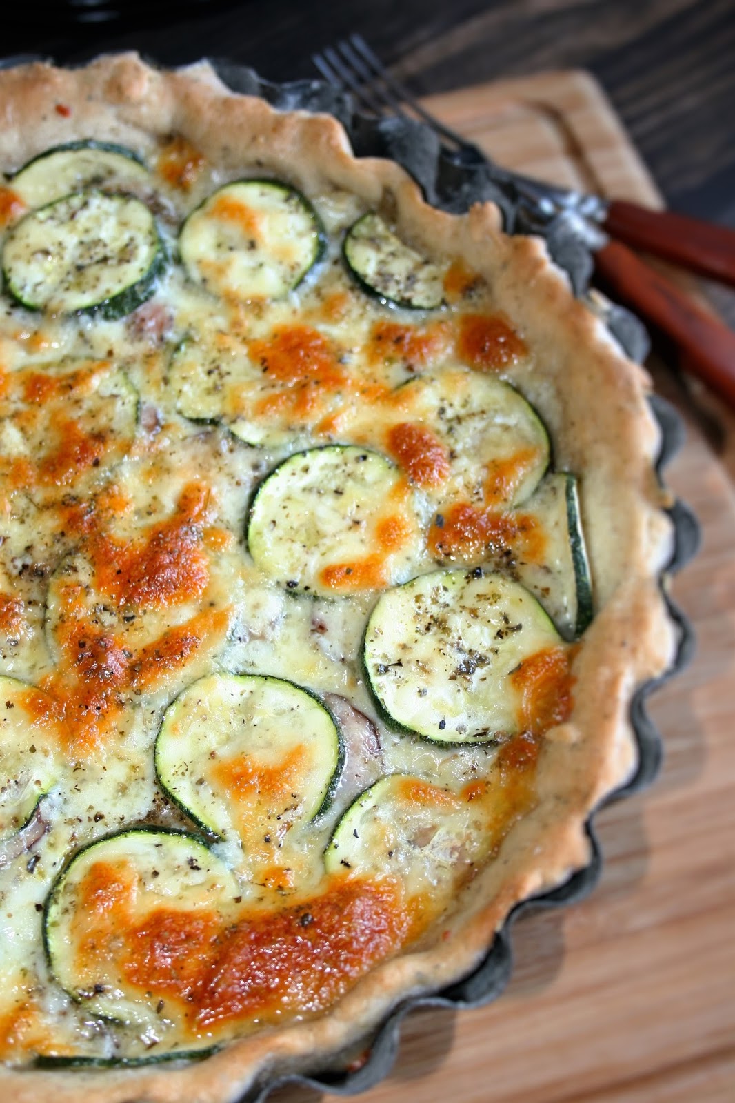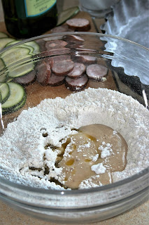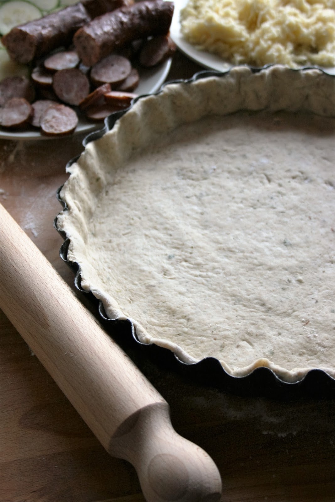 Goście wyjechali, czas wrócić do normalnego życia :) Ale rozleniwiłam się trochę przez ten tydzień, a że jeszcze dziś niedziela, i że za oknem pewnie ze 30 stopni, to nikt by mnie nie namówił do jakiegoś skomplikowanego obiadu. Dlatego - pizza! Ale za to jaka - na chlebowym cieście, z dużą ilością sera, soczystą cukinią i bardzo aromatyczną kiełbaską. Taka smaczna, że hej! Prosty i czysty smak, trochę jakbyście jedli ciepłą pajdę ledwie upieczonego chleba ze wspaniałą domową kiełbaską, musztardą ( no i zielem, czyli cukinią - dla zdrowia rzecz jasna :) )