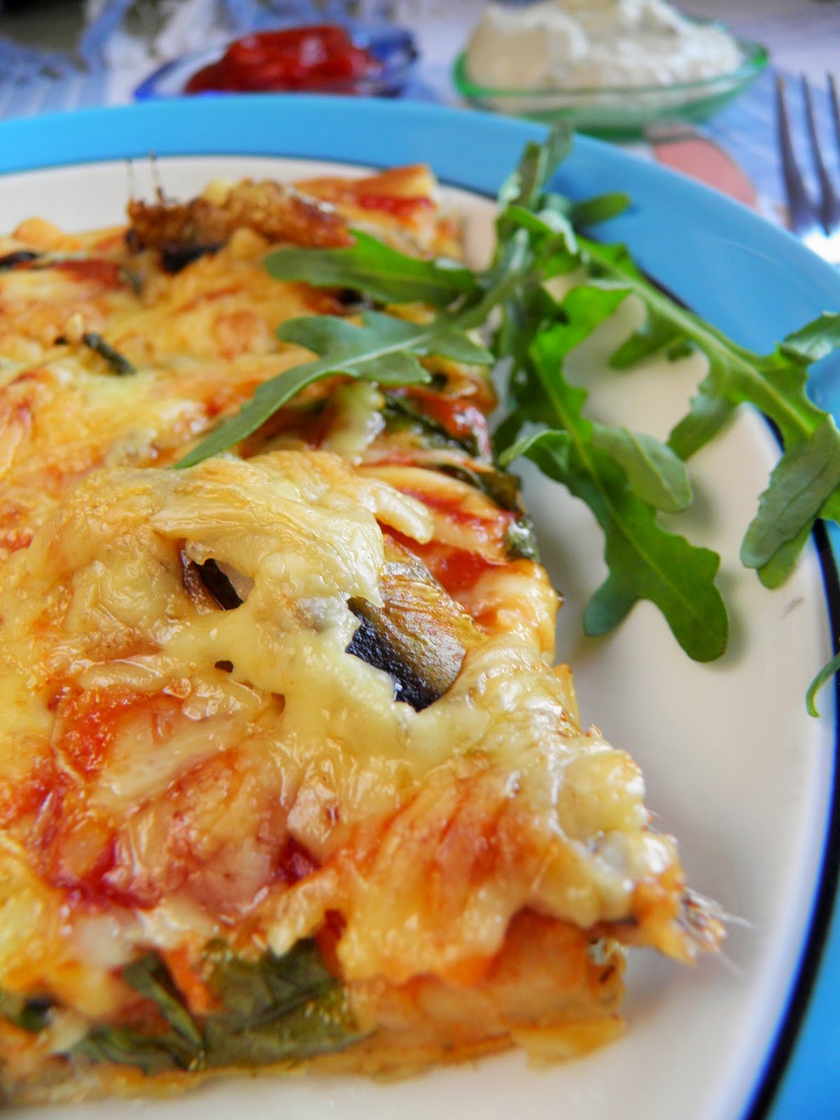 Pizza o dość intensywnym smaku, piątkowa, bo z wędzonymi szprotkami :) Miałam dziś mało czasu, bo cały dzień zajęty przez szkolenie, a po powrocie do domu jeść się chciało, oj chciało :) Po przeglądzie lodówki stwierdziłam, że muszę jutro koniecznie jechać na zakupy, ale że trzeba było coś przygotować, padło na szybką, niezawodną pizzę. Bardzo nam podpasowało połączenie smaku wędzonej ryby z rukolą i porem, całość pysznie smakuje z sosem jogurtowym. Spróbujcie koniecznie :)
