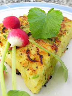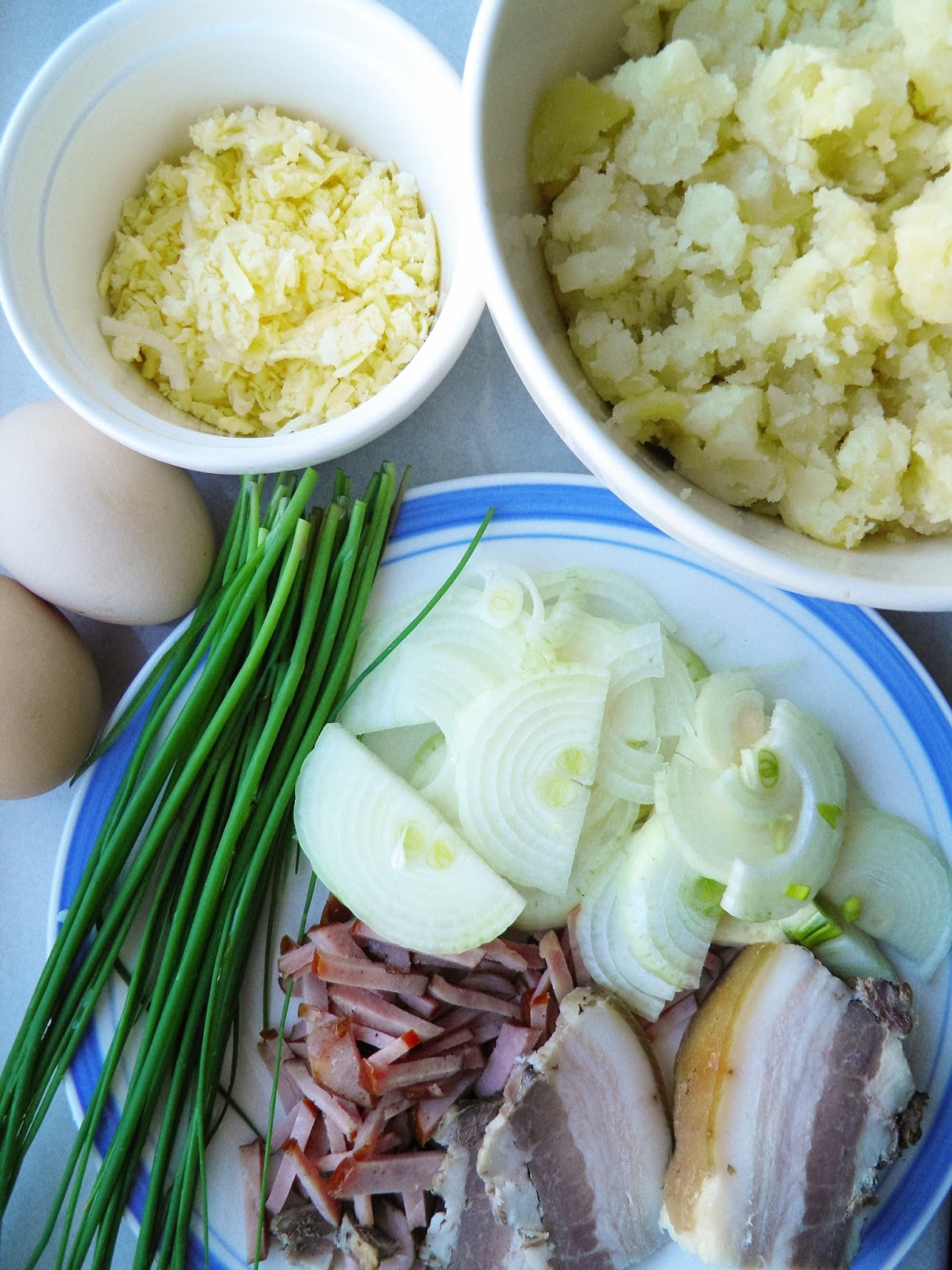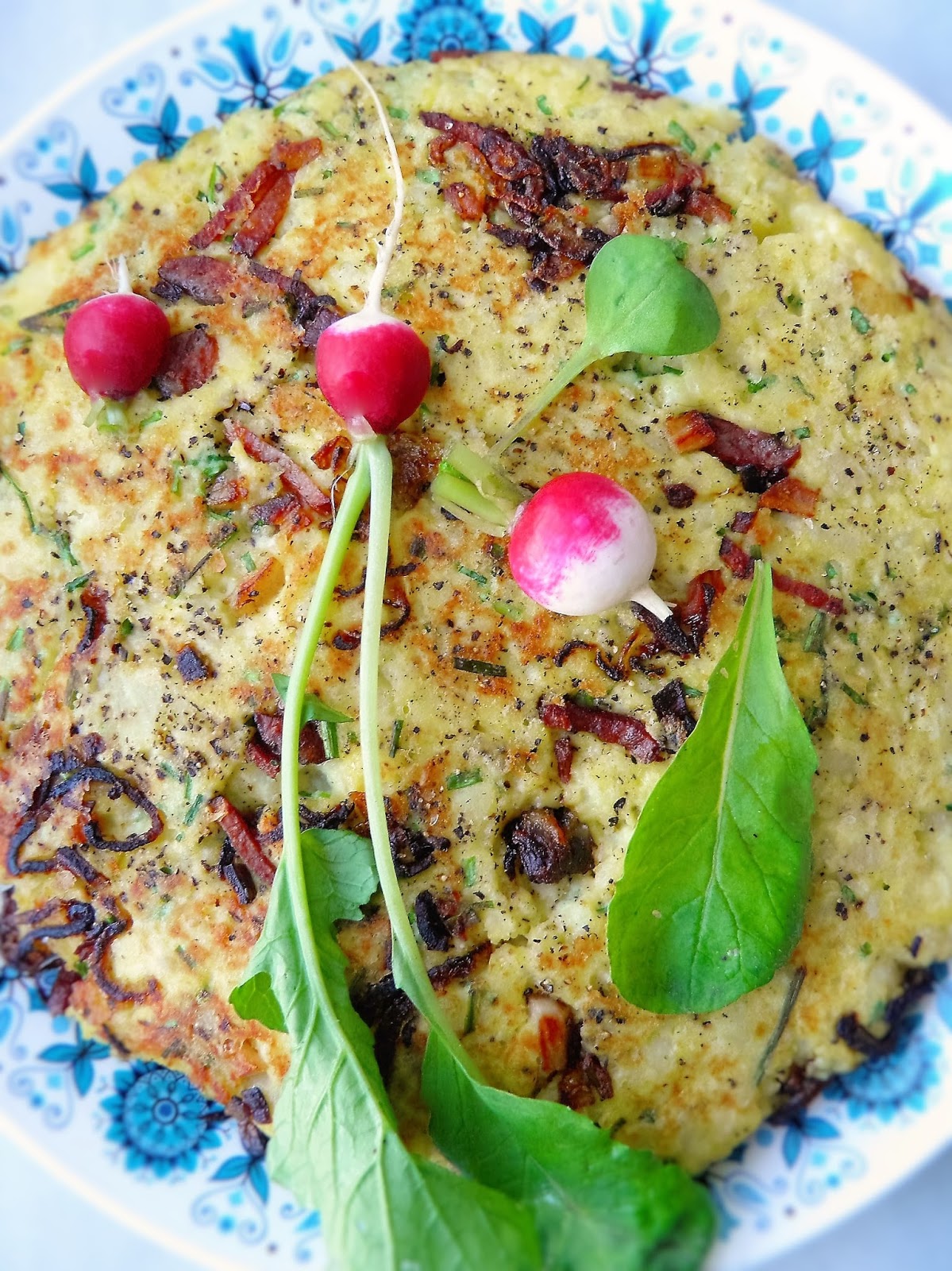 Składniki (2-3 porcje):ok. 0,5 kg ugotowanych ziemniaków (z obiadu)1 cebulaboczek, kiełbasaszczypiorek2-3 jajkatarty żółty ser (u mnie mozzarella)sól, pieprz do smaku1 łyżka olejuPrzygotowanie:Obraną cebulę kroję w piórka lub półplasterki, drobno kiełbasę i boczek - wrzucam je na patelnię z olejem i podsmażam razem do zeszklenia cebuli. Ziemniaki dość dokładnie mieszam (łyżką) z jajkami, posiekanym szczypiorkiem, startym serem i solą oraz pieprzem do smaku. Masę rozkładam na podsmażonej cebuli, lekko ubijam i smażę na wolnym ogniu ok. 10 minut - spód placka powinien się zarumienić. Wtedy przekładam placek na drugą stronę (za pomocą talerza lub pokrywki) i smażę kolejne 8-10 minut. Podaję na gorąco.