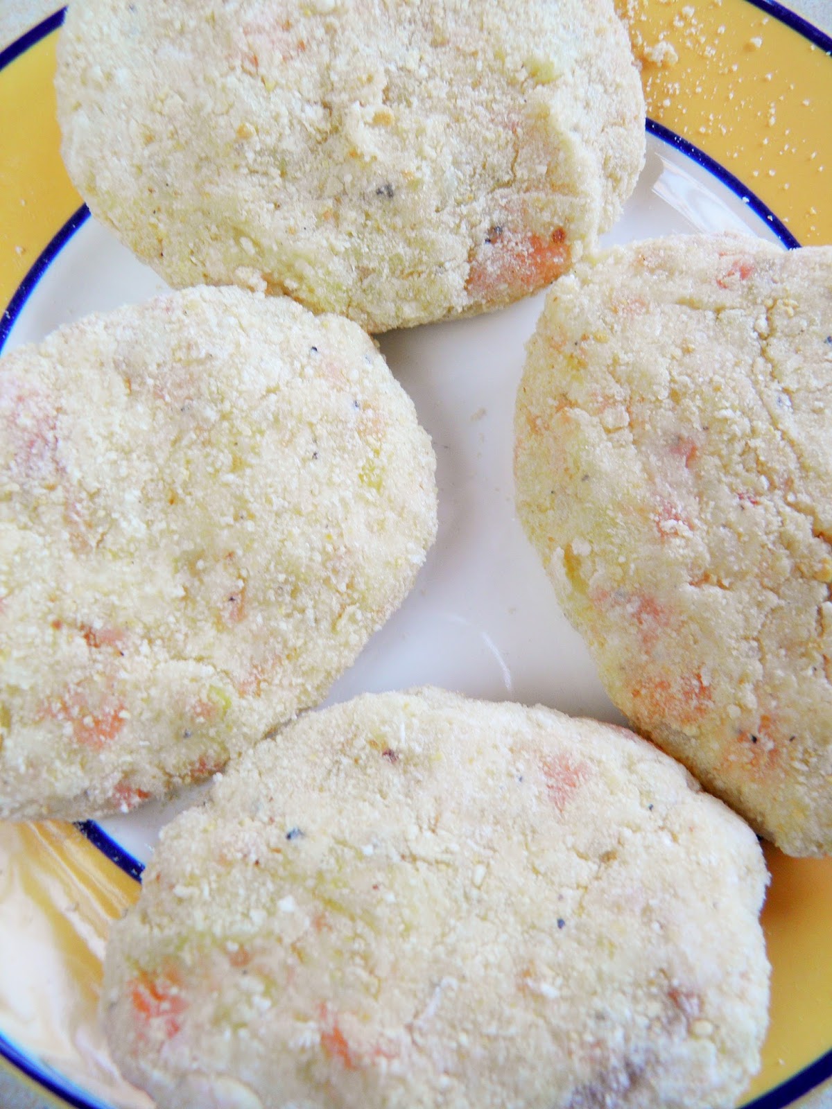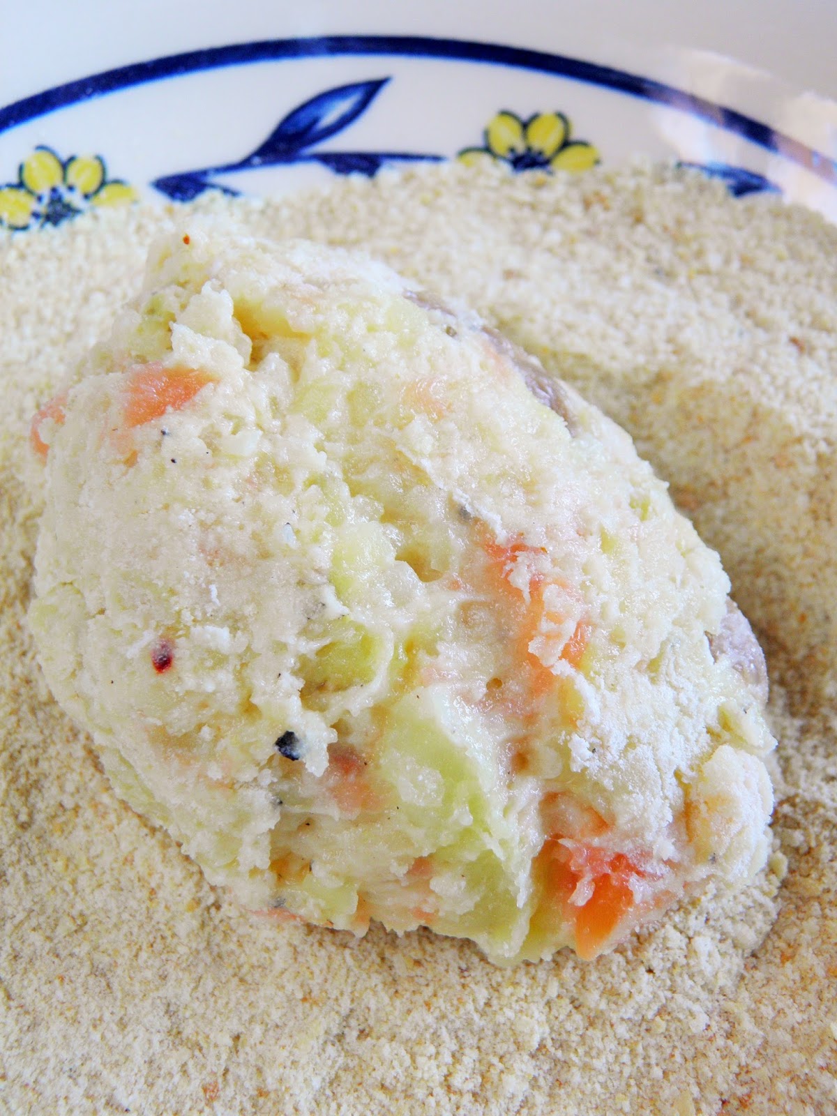 Obrane ziemniaki gotuję do miękkości, po czym dusze widelcem (nie musi być bardzo dokładnie). Łososia siekam na małe kawałki, dodaję do poduszonych ziemniaków, doprawiam solą i sporą ilością pieprzu. Dodaję tyle mąki, by ciasto się nie kleiło do łyżki - wyrabiam z grubsza (jeśli będzie za długo mieszane, będzie rzadkie). Łyżką nabieram solidną porcję, przekładam ją do miseczki z bułką tarta, obtaczam i dopiero wtedy formuję dość płaskie, podłużne kotlety. Smażę je z obu stron na rumiano.