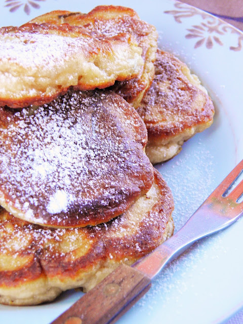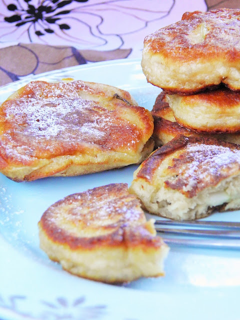 Składniki na ok. 20 sztuk:1 szklanka maślanki naturalnej2 jajka1 czubata łyżka cukru pudru + puder do posypania1 szklanka mąki pszennej + 2 łyżki1,5 łyżeczki sody5-6 średnich jabłekolej do smażeniaPrzygotowanie: Z maślanki, jajek, mąki i pudru trzepaczką ubijam dość gęste ciasto, dodaję sodę. Jabłka dokładnie myję, kroję na ćwiartki, wycinam gniazda nasienne i dalej kroję na dość grube plasterki - ze skórką. Dodaję je do ciasta, mieszam. Na patelni rozgrzewam niewielką ilość oleju i wykładam łyżką porcje ciasta, smażę po 2-3 minuty z każdej strony na rumiano. Po usmażeniu przekładam placki na chwilę na talerz wyłożony papierem, by odsączyć nadmiar tłuszczu. Podaję oprószone cukrem pudrem.Przepis autorski.