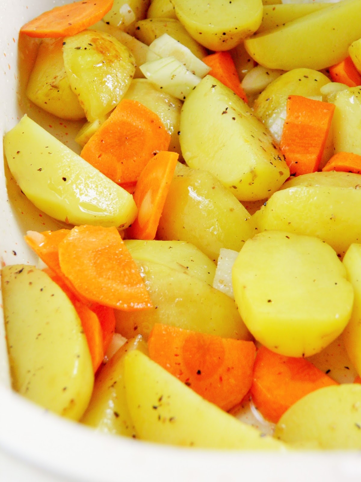 Polędwiczkę obieram ze ścięgien i kroję w 3 cm kawałki, lekko je spłaszczam. Ziemniaki myję dokładnie szczoteczką, obieram marchewki i cebulę. W brytfance rozgrzewam olej, wkładam przekrojone na ćwiartki ziemniaki, lekko je solę i pod przykryciem smażę 5 minut. Następnie dodaję pokrojoną w kostkę cebulę i marchewki (w plasterki). Smażę, mieszając od czasu do czasu (dalej pod pokrywką), aż zupełnie zmiękną. Dodaję posiekaną natkę pietruszki, doprawiam solą i pieprzem, po czym wyjmuję warzywa z brytfanki, zwiększam ogień i na ten sam tłuszcz wkładam polędwicę - smażę ją po 3 minuty z każdej strony. Gdy się zrumieni, dokładam z powrotem warzywa, duszę razem 5 minut, po czym dolewam śmietankę, ewentualnie jeszcze raz całość doprawiam. Podaję z surówką.