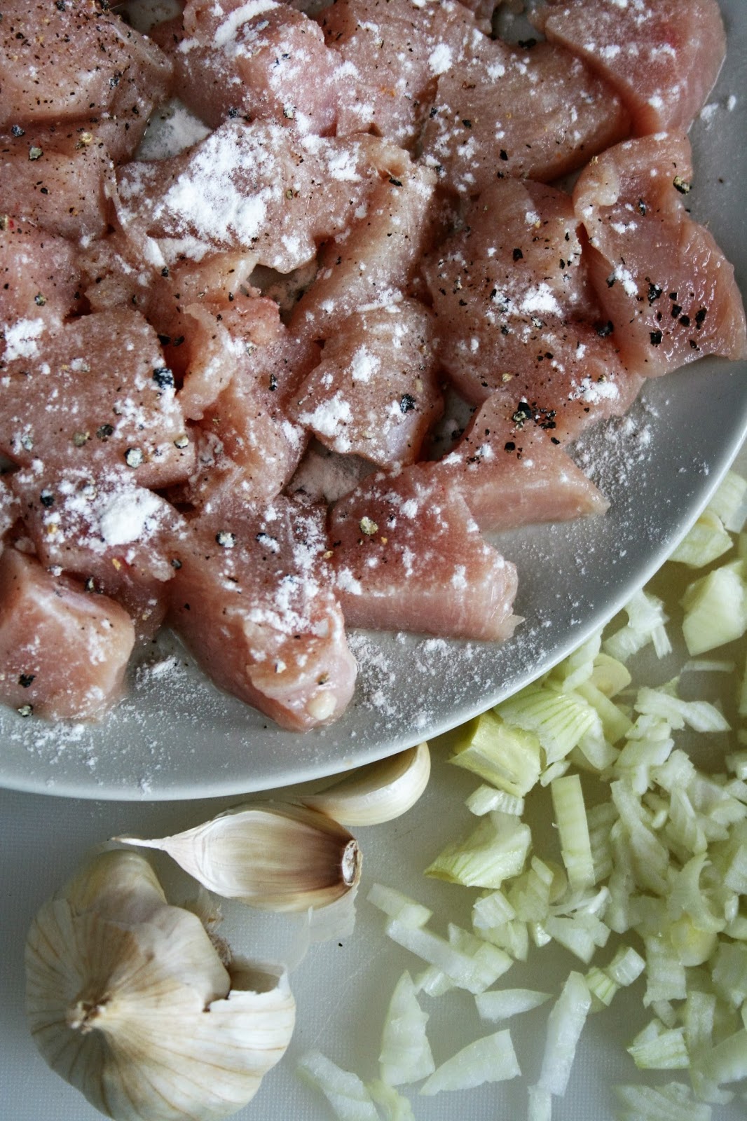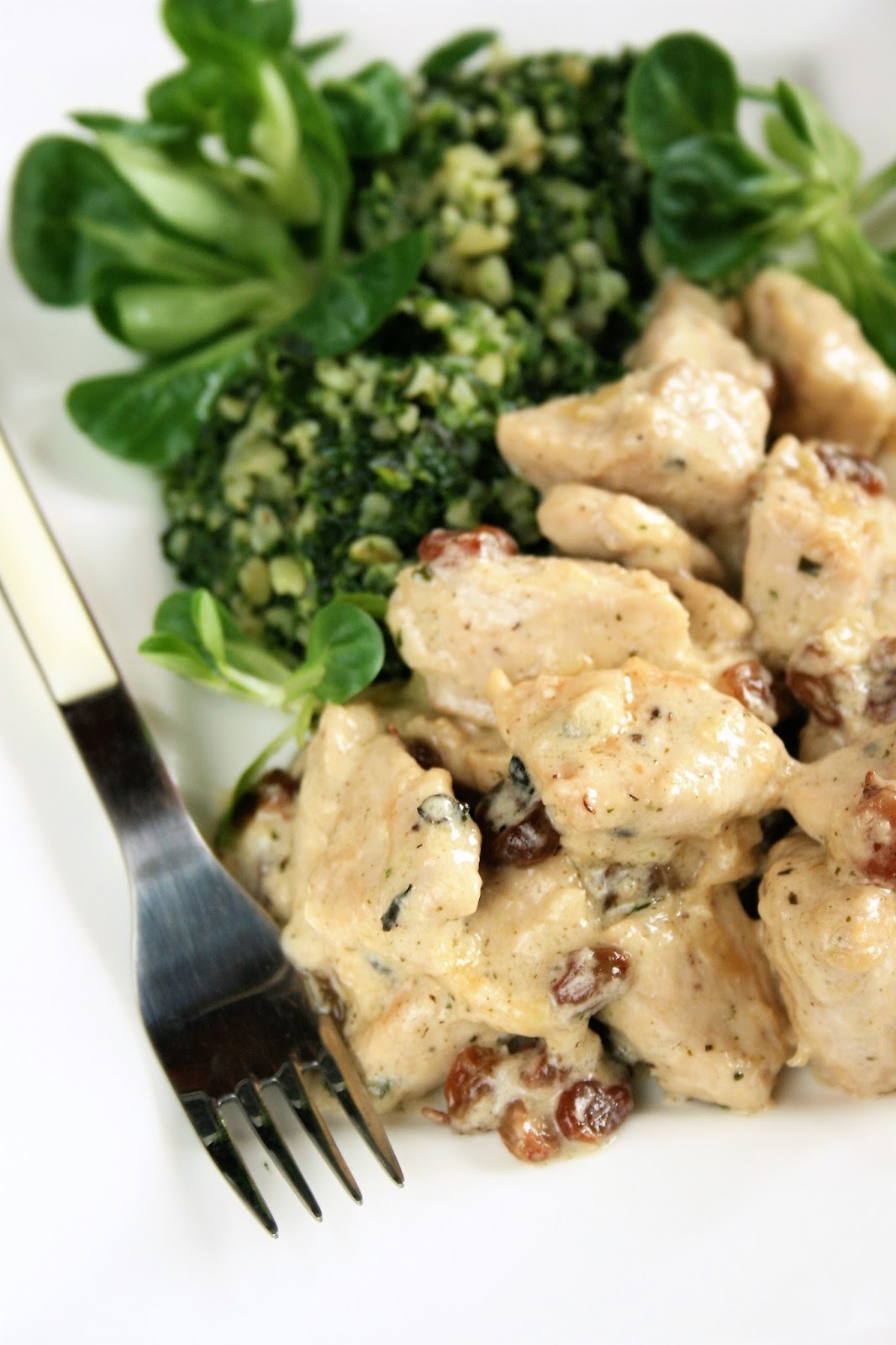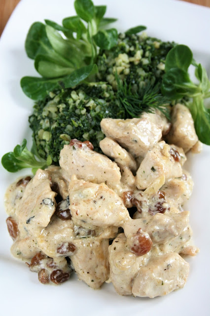 Zależało mi dziś na szybkim i nieskomplikowanym obiedzie, przygotowałam więc bardzo smaczną potrawkę z piersi kurczaka, w sosie śmietanowym, z czosnkiem i szczyptą estragonu, no i z rodzynkami. Podałam ją z kaszą bulgur i szpinakiem.