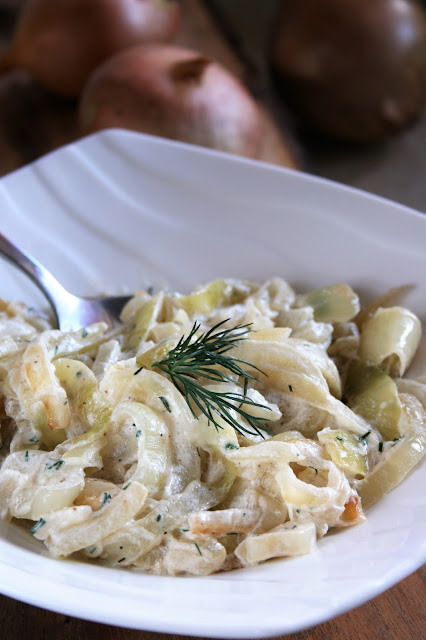 Chociaż takie połączenie może wydawać się dziwne i nietypowe, to cebula przygotowana w sposób, o którym zaraz opowiem, jest naprawdę bardzo smaczna. A sposób to banalnie prosty, bo cebulkę po prostu udusiłam na niewielkiej ilości oleju, by stała się mięciutka i słodka, po czym poddusiłam jeszcze przez chwilę z gęstą śmietaną. Do tego posiekany koperek - i gotowe. Polecam, spróbujcie!