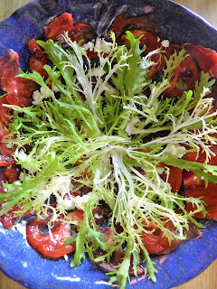 Składniki na 1 porcję:1 średniej wielkości pomidor malinowy (z małą ilością pestek, miąższysty)garść endywiikiełki brokułagarść orzechów włoskich, podprażonych na suchej patelni1 łyżka pokruszonej fetybazylia drobnolistnaczerwona cebulaolej z pestek dyni, polecam Woj-Lenświeżo mielony czarny pieprzsól Przygotowanie:Endywię i pomidora myję i osuszam. Połowę pomidora kroję w bardzo cienkie plasterki i układam je na ściankach płaskiej miseczki. Posypuję pomidora listkami bazylii i pokruszoną fetą. Układam endywię, a potem na środek wrzucam resztę pomidora pokrojoną w kawałki. Posypuje wszystko orzechami, bazylią, cienko pokrojoną cebulą. Doprawiam solą i pieprzem, skrapiam olejem z pestek dyni. Podaję od razu.