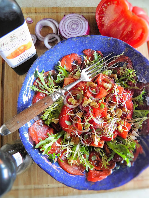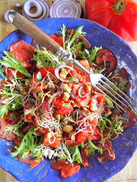 Czas chyba przyzwyczaić się do upałów (nie powiem, żebym była z tego powodu zbyt szczęśliwa, dla mnie optymalna temperatura to jakieś 25 stopni). Skoro tak gorąco, trzeba zadbać o nawodnienie organizmu - oczywiście pijemy duuużo wody, ale i wiele posiłków może nam jej dodatkowo dostarczyć. Na przykład sałatka z soczystych pomidorów malinowych. Jest pyszna, lekka i moim zdaniem idealna na letnie upały.