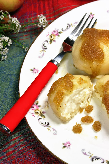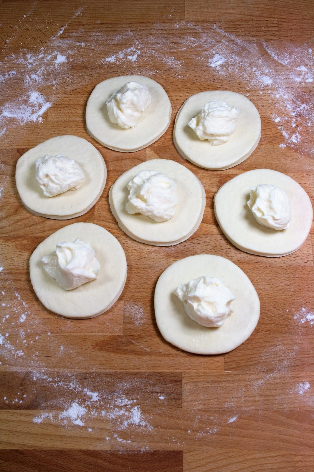 Drożdże ucieram z cukrem, dodaję łyżeczkę mąki i jogurt, mieszam na gładką pastę i odstawiam zaczyn na 10 minut w ciepłe miejsce, by drożdże zaczęły pracować. Wyrośnięty zaczyn dodaję do mąki z solą, dolewam śmietankę i olej, mieszam ciasto łyżką podlewając wodą - aż składniki zbiją się w kulę. Wtedy wyrabiam ciasto dłonią, ewentualnie podsypując lekko mąką. Wyrabiam ok. 5 minut. Ciasto powinno być elastyczne i gładkie. Przykrywam miskę i odstawiam je do wyrośnięcia - do podwojenia objętości. Wyrośnięte zagniatam krótko, by pozbyć się gazów, dzielę na dwie części i każdą rozwałkowuję na placek grubości ok. 0,5 cm. Wycinam kółka (u mnie średnica 10 cm), na każde wykładam po porcji sera (dokładnie wymieszanego z cukrem i żółtkami). Sklejam każdą pyzę, zamykając ser w środku. Przygotowane pyzy odkładam na 20 minut, by się napuszyły, po czym gotuję we wrzącej, odrobinę osolonej wodzie ok. 7-8 minut. Podaję na gorąco, ze zrumienioną na maśle bułką tarta, posypane cukrem.