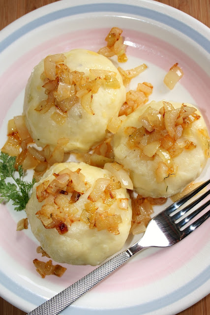 : dzielę ciasto na 8 części, każdą spłaszczam, nakładam porcję farszu i dokładnie sklejam. Pyzy wkładam do gotującej się, osolonej wody i gotuję 5 minut od wypłynięcia. Podaję z podsmażoną cebulką.