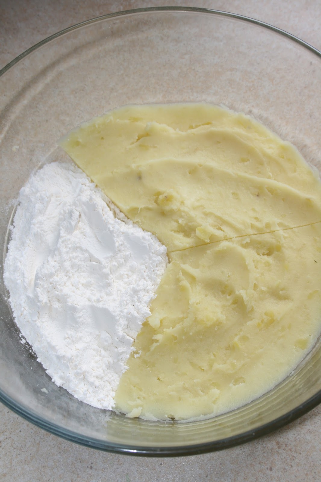 : przestudzone ziemniaki przekładam do miski. Wyrównuję powierzchnię, dzielę ziemniaki na 3 równe części (jak na zdjęciu). Jedną część ziemniaków wyjmuję, a w jej miejsce wsypuję tyle mąki, by je wypełniła. Dodaję jajko, odłożoną część ziemniaków, sól do smaku, mieszam łyżką do połączenia się składników. ciasto przekładam na podsypaną mąką stolnicę, krótko zagniatam (zbyt długie wyrabianie powoduje, że ciasto robi się rzadkie i klejące).