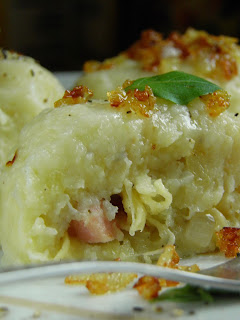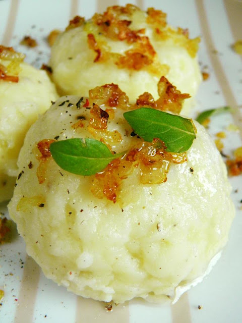 Pyzy ziemniaczane nadziewane cebulką, serem i boczkiem