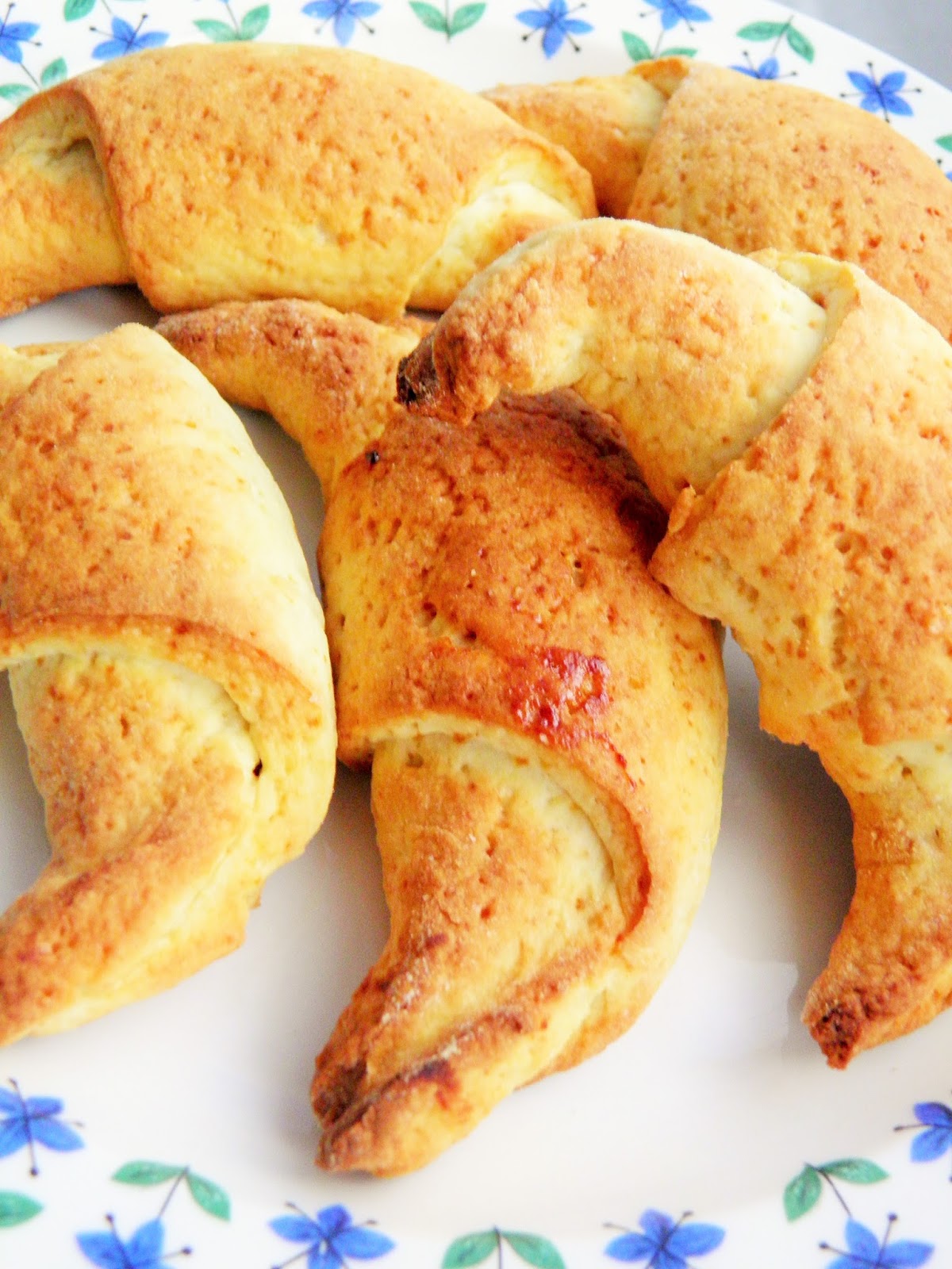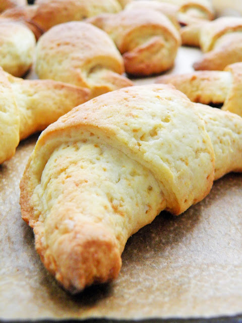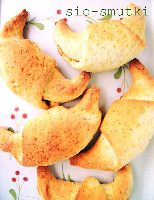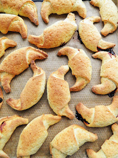 Wczorajsza pogoda - zwłaszcza ten niesamowity wiatr - skłoniła mnie do upieczenia rogalików, żeby przyjemniej nam się siedziało w domu z kubkiem kawy. Jako że zostało jeszcze dziś kilkanaście sztuk, mogę też potwierdzić, że równie smaczne jak tuż po pieczeniu są następnego dnia. Proste składniki, a rogaliki łatwe w przygotowaniu, więc gdybyście mieli ochotę na coś co uprzyjemni popołudnie, zachęcam do upieczenia.