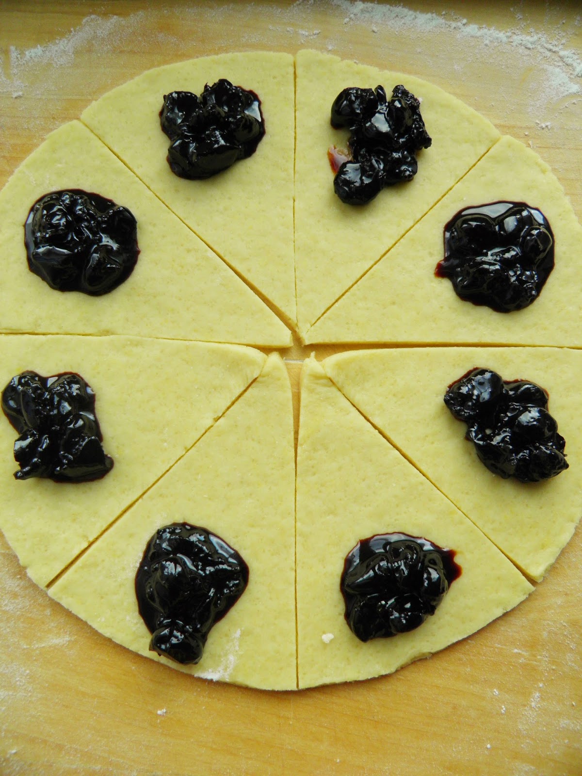 Składniki:4 szklanki mąki pszennej125 g. miękkiego masła3 czubate łyżki śmietany 18%3/4 szklanki cukru2 łyżki cukru waniliowego1 pełna łyżeczka proszku do pieczeniakonfitury wiśniowePrzygotowanie: Przesiewam mąkę z proszkiem do pieczenia do miski, dodaję pozostałe składniki z wyjątkiem konfitur, zagniatam ciasto w całość. Dzielę je na 4-5 części, każdą rozwałkowuję na kształt koła. Koła dzielę na trójkąty, wykładam po porcji powideł i zwijam od szerszego końca rogaliki. Przekładam rogaliki na blachę wyłożoną papierem, wstawiam blachę do piekarnika nagrzanego do 180 stopni C. na ok. 30 minut - rogaliki powinny by złote.Przepis autorski.