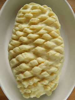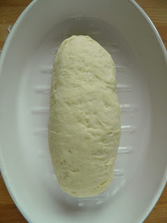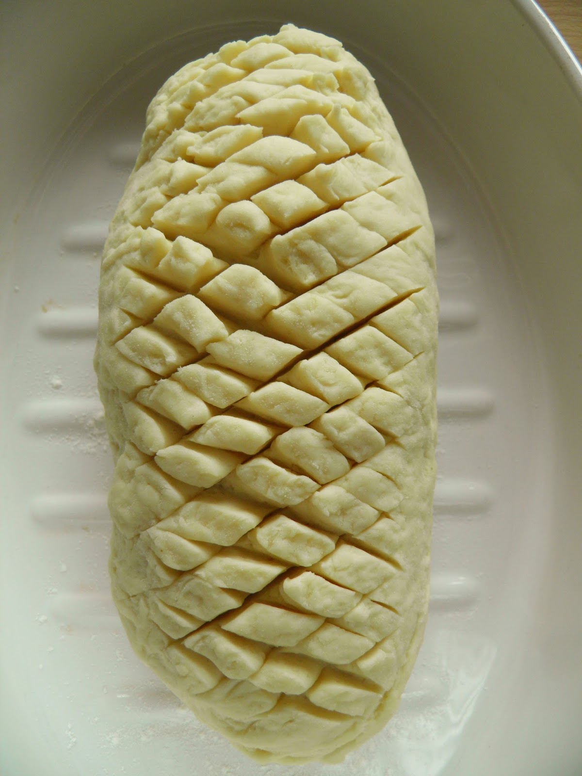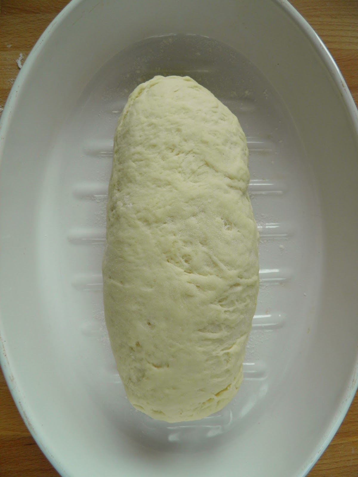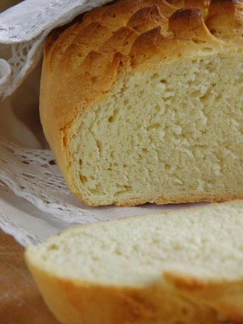 Pokruszone drożdże ucieram z cukrem, dodaję kilka łyżek mleka i łyżkę mąki, mieszam wszystko na pastę. Odstawiam pod przykryciem na 20 minut do wyrośnięcia. Pozostałą mąkę przesiewam do dużej miski, dodaję miękki smalec, pozostałe mleko, wyrośnięty zaczyn i wodę - zagniatam ciasto - będzie dość twarde (ewentualnie można dolać jeszcze trochę wody). Wyrabiam ciasto przez ok. 5 minut, po czym formuję kulę, przekładam do oprószonej mąką miski, przykrywam i odstawiam w ciepłe miejsce na godzinę. W tym czasie ciasto powinno podwoić objętość. Krótko je zagniatam i formuję w podłużny bochenek, który przekładam do formy i ostrym nożem nacinam w kratkę na głębokość ok. 1 cm. Odstawiam znów do wyrośnięcia na ok. 30 minut, po czym wstawiam do piekarnika nagrzanego do 220 stopni C. Piekę 30 minut, zmniejszam temperaturę do 200 stopni i piekę jeszcze 20 minut.