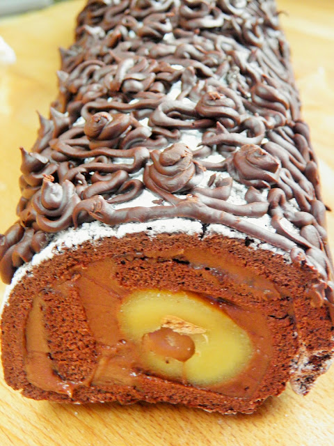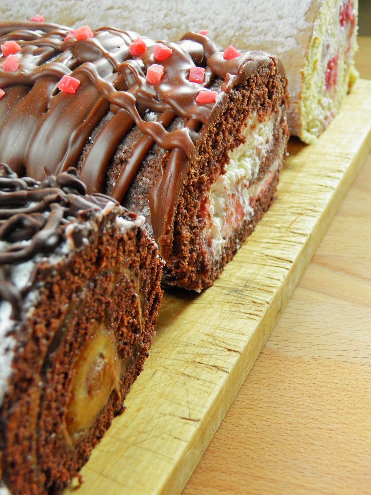 Roladka z puszystym kakaowym biszkoptem, z delikatną masą na bazie kremówki i mascarpone, której środek stanowi galaretkowe serce, wierzch oblewa aromatyczna czekolada, a wierzchołek zdobią wisienki koktajlowe oraz kryształki galaretki to propozycja id...