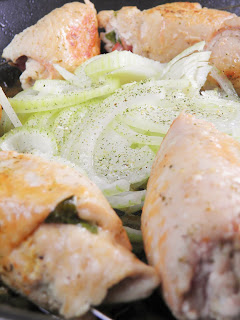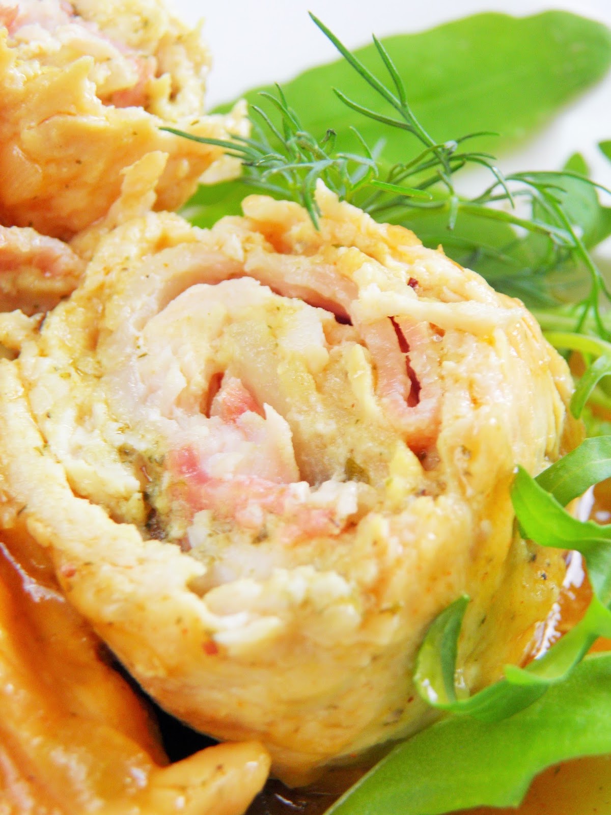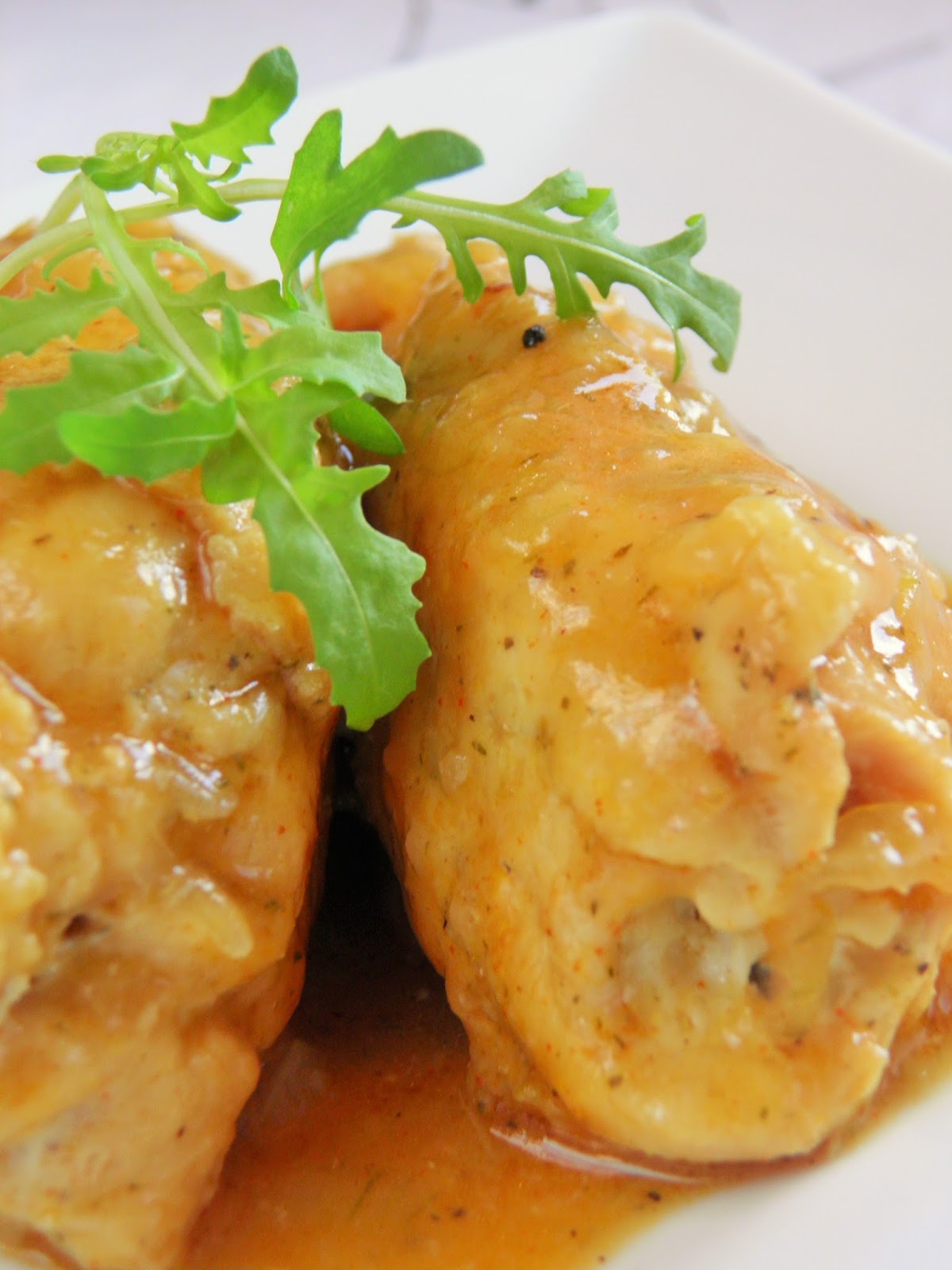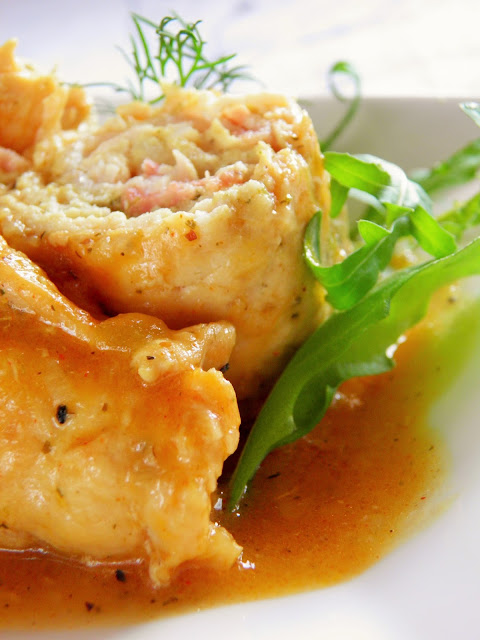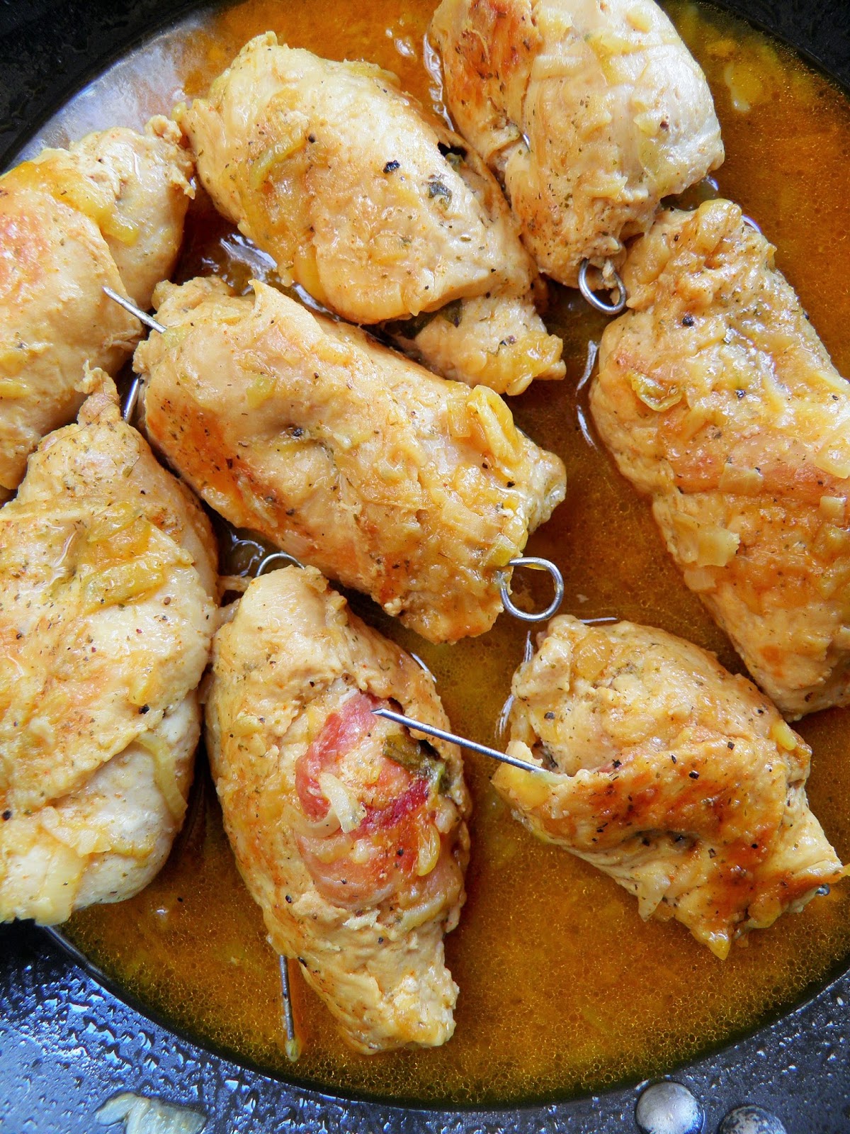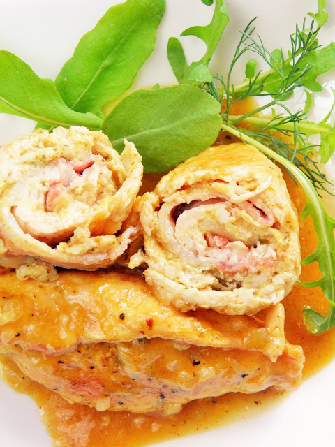 Składniki:4 duże filety z kurczaka24 liście rukoli8 plastrów boczku wędzonego2-3 łyżki niezbyt ostrej musztardysól, pieprzodrobina suszonego majeranku olej do smażenia1 duża cebula0,5 płaskiej łyżeczki słodkiej, mielonej paprykiwoda1,5 łyżeczki mąki pszennejPrzygotowanie: Oczyszczone filety przekrajam wzdłuż na pół i każdą część rozbijam dość cienko tłuczkiem, uważając żeby mięso się nie przerwało. Oprószam je solą, majerankiem i pieprzem, smaruję lekko musztardą, po czym na każdym płacie układam po 3 liście rukoli i po jednym plastrze boczku. Zwijam mięso w roladkę, spinam. Tak przygotowane roladki podsmażam po kilka minut z każdej strony na niewielkiej ilości oleju. Obraną cebulę kroję cienko, na patelni odsuwam mięso na jej brzegi, a na środku układam cebulę, lekko ją solę i pod pokrywką smażę na małym ogniu, aż się zeszkli. W międzyczasie lekko przewracam roladki - im będzie to spokojniejszy i wolniejszy proces, tym mięso będzie smaczniejsze. Gdy cebula jest mięciutka, dodaję jeszcze pół łyżeczki musztardy do cebuli, mieszam i duszę ok. 10 minut. Po tym czasie dolewam ok. pół szklanki wody i dalej wszystko duszę pod przykryciem. Dodaję paprykę, mieszam, uzupełniam wodę - łącznie proces duszenia mięsa (już z cebulą) trwa ok. godziny. Powinien wytworzyć się dość gęsty sos, doprawiam go do smaku solą i pieprzem, dolewam jeszcze trochę wody. W 3 łyżkach lekko przestudzonego sosu dokładnie mieszam mąkę, zawiesinę dodaję do reszty, mieszam do zgęstnienia. Całość duszę jeszcze kilka minut. Przed podaniem wyjmuję szpilki/wykałaczki.