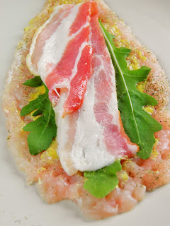 Roladki są naprawdę wyśmienite, rozpływają się w ustach. Dusiły się długo z cebulą, i to z niej powstał pyszny, bardzo pachnący sos. Mięso rozbiłam dość mocno, by powstały cienkie płaty; doprawiłam je musztardą, solą i pieprzem, nadziałam wędzonym boczkiem i liśćmi rukoli.