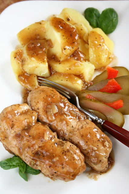 Roladki z kurczaka w sosie grzybowym i pęczak z boczkiem i cebulką